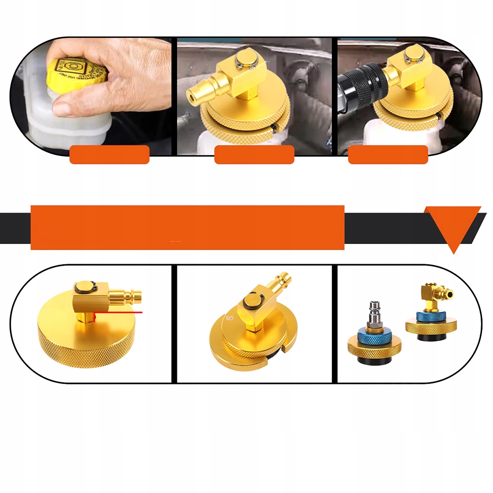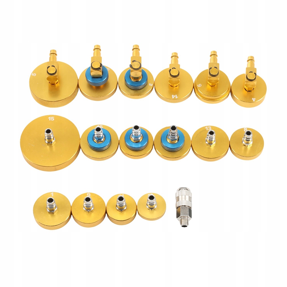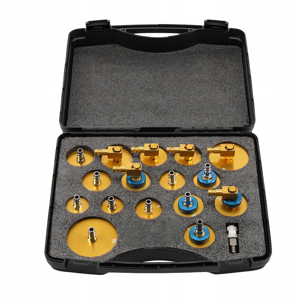 Набір інструментів для прокачки головного циліндра включає 16 позолочених наконечників і швидкий з’єднувач. Всі перехідники ідеально підходять і герметичні. Ці адаптери виготовлені з високостійкого до корозії алюмінію. Метал і поверхня мають відмінну якість і антиокислювальні властивості.