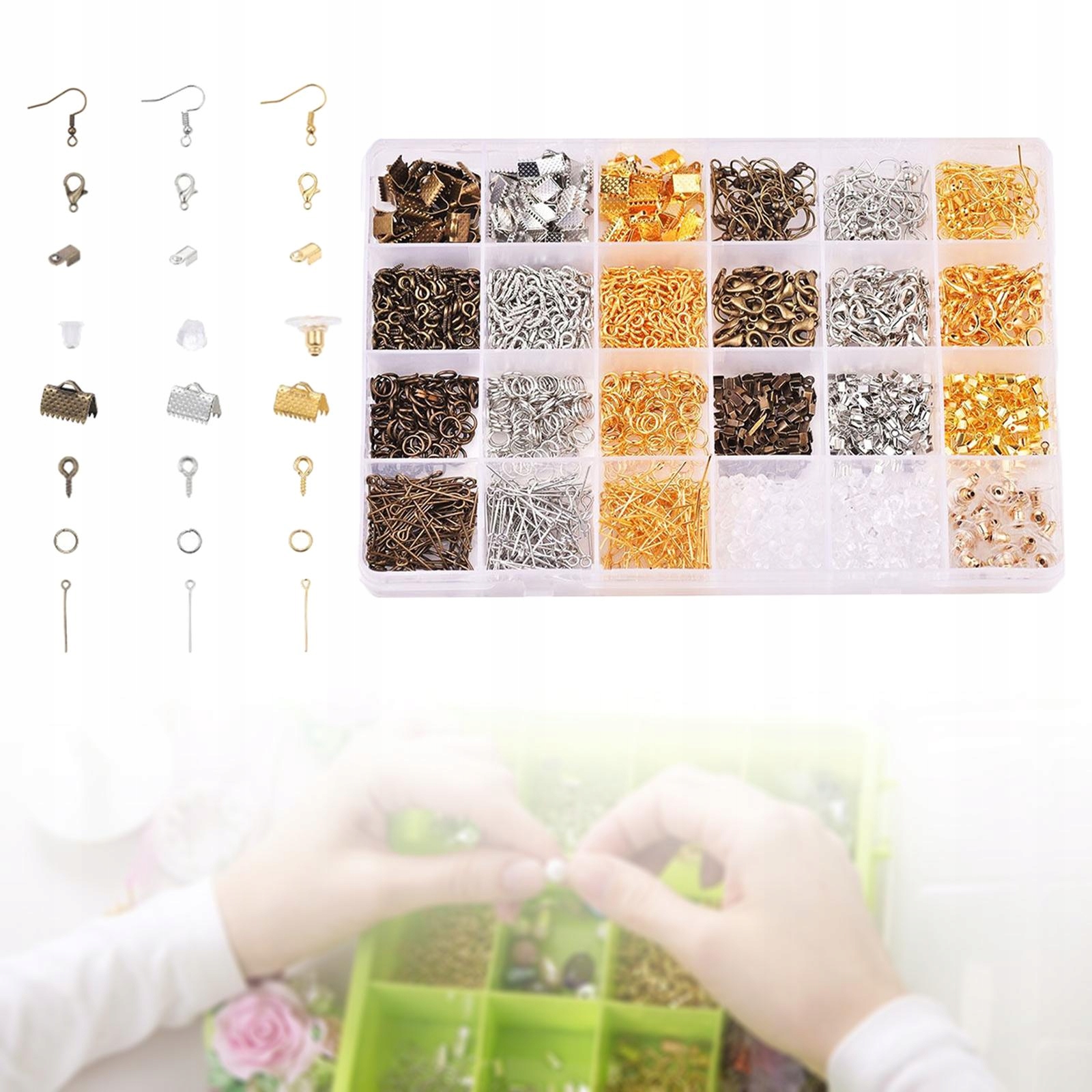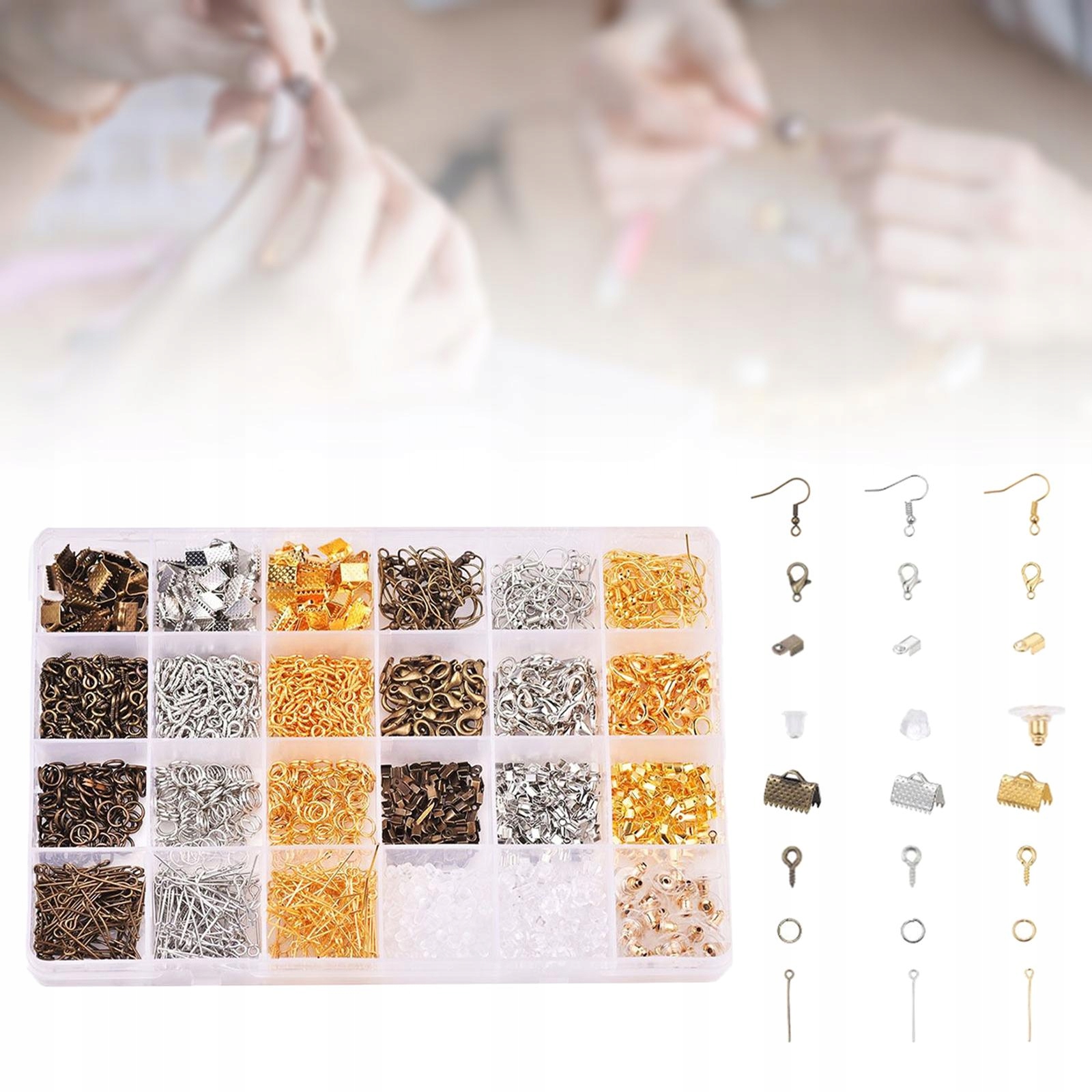 містить: 90 шт. Заключні затискачі, 90 шт. Відкриті кріпильні колеса, 300 затискачів, 300 очей, 230 шт. Кріплення для сережок.