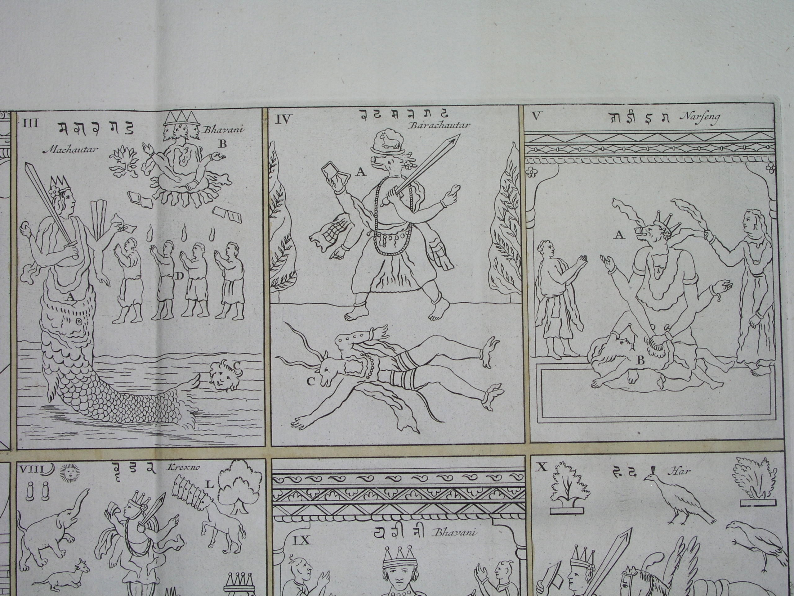 ОРИГІНАЛЬНА ГРАФІКА із зображенням пантеону індуїстських божеств. Опубліковано в багатотомній праці Бернара Пікара під назвою «Ceremonies et coutumes religieuses de tous le peuples du monde...», виданої J.F. Bernarda, Амстердам 1723. Це гравюра на міді, надрукована на аркуші ребристого паперу ручної роботи; реверс без друку. ------ Розміри графіки приблизно 39 на 21 см, а загальні розміри приблизно 45 на 29 см. ------ Дуже добрий стан (лише мінімальний бруд і легка зміна кольору паперу); карта складена втричі поперек.
