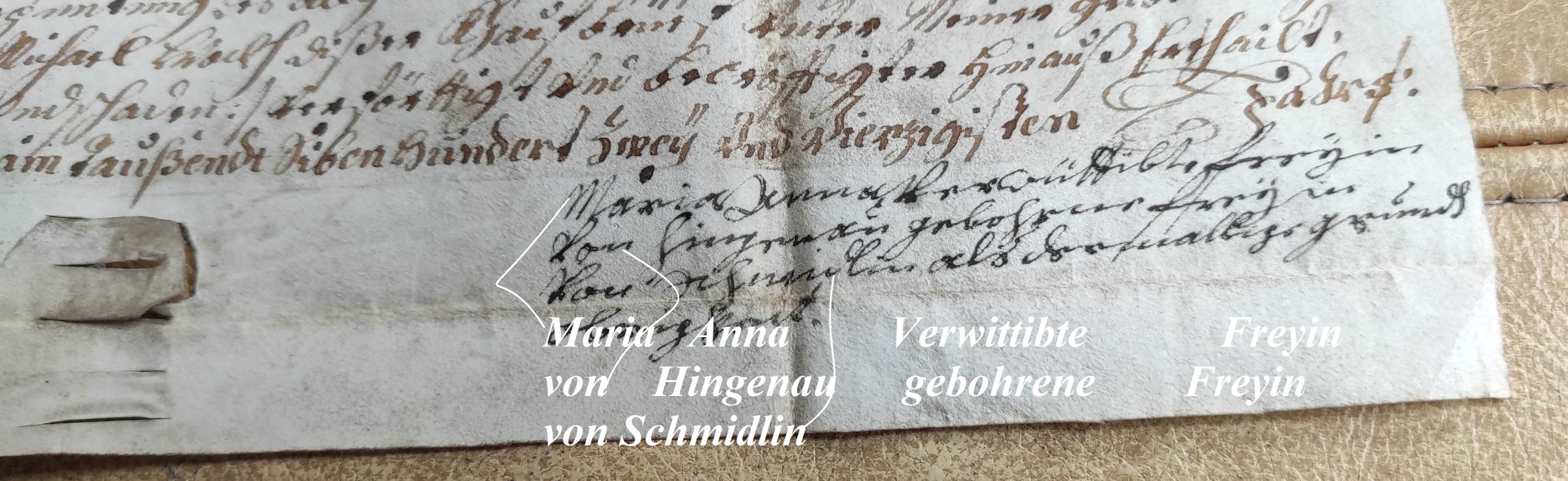 Kauf-brief (документ про продаж) від 28 лютого 1742 р. на пергаменті на суму 3650 (гульденів?), виданий і написаний внизу рукою баронеси Марії Анни, вдови фон Хінгенау, уродженої баронеси фон Шмідлін. Розмір документа: приблизно 32 x 19 - практично написаний від поля до поля, що трапляється рідко. Лист починається з дуже вишуканого ініціалу I, що йде вздовж лівого поля майже до кінця листа. І - лист починається словами Ich Maria Anna Verwittibte Freyin von Hingenau eine gebohrne Freyin von Schmidlin... - Ja Maria Anna, baroness von Hingenau, baroness née Schmidlin...