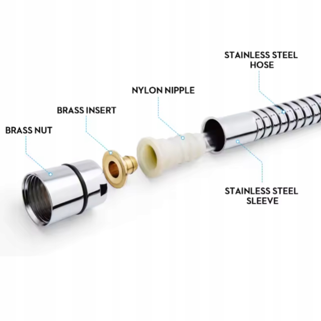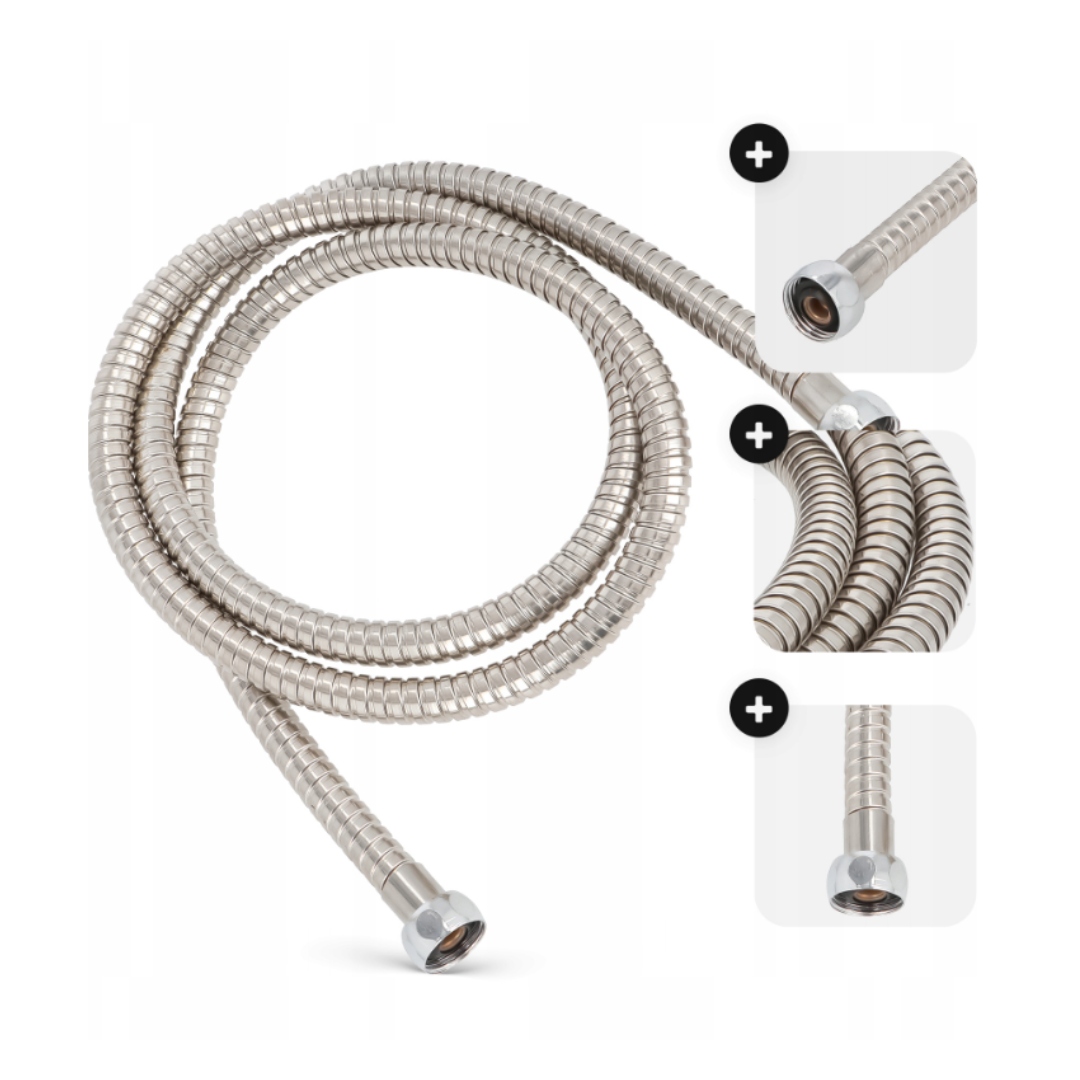 душові кабелі, виготовлені з пластику з хромованою косою для ручної розпилення або розпилення. Гнучкі та дуже міцні, стійкі напруження.