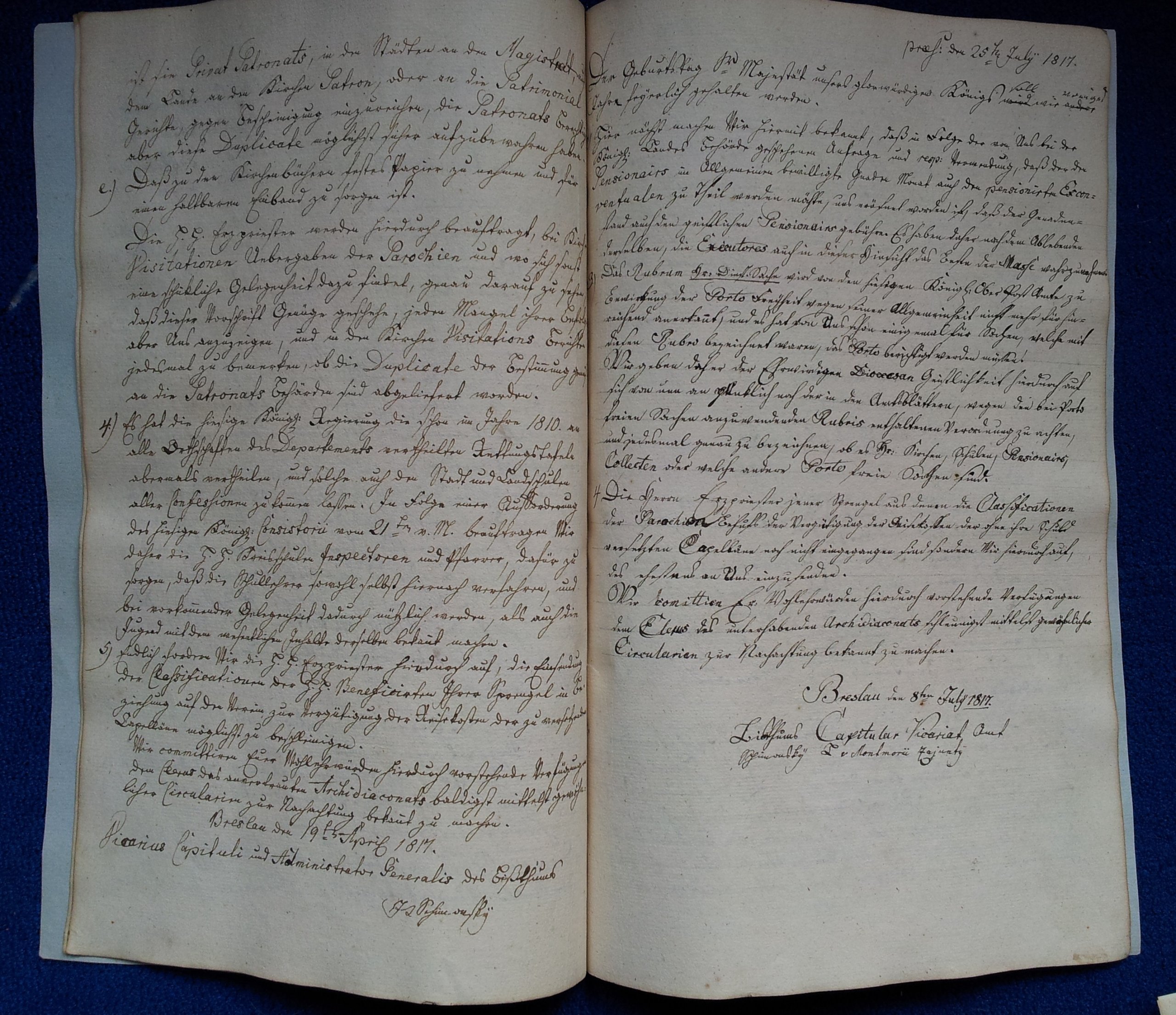 Рукопис на папері 1751 року. Записи охоплюють 1817-1818 роки. Німецький. Це реєстр листування – зміст листа переписували, щоб все було в одній книзі. 12 сторінок рукопису. Листи з: Бреслау (Вроцлав), Лігніц (Легніца) та 1 з Берліна (за підписом Фрідріх Вільгельм – король Пруссії). Обкладинка з паперу пізнішої ручної роботи.
