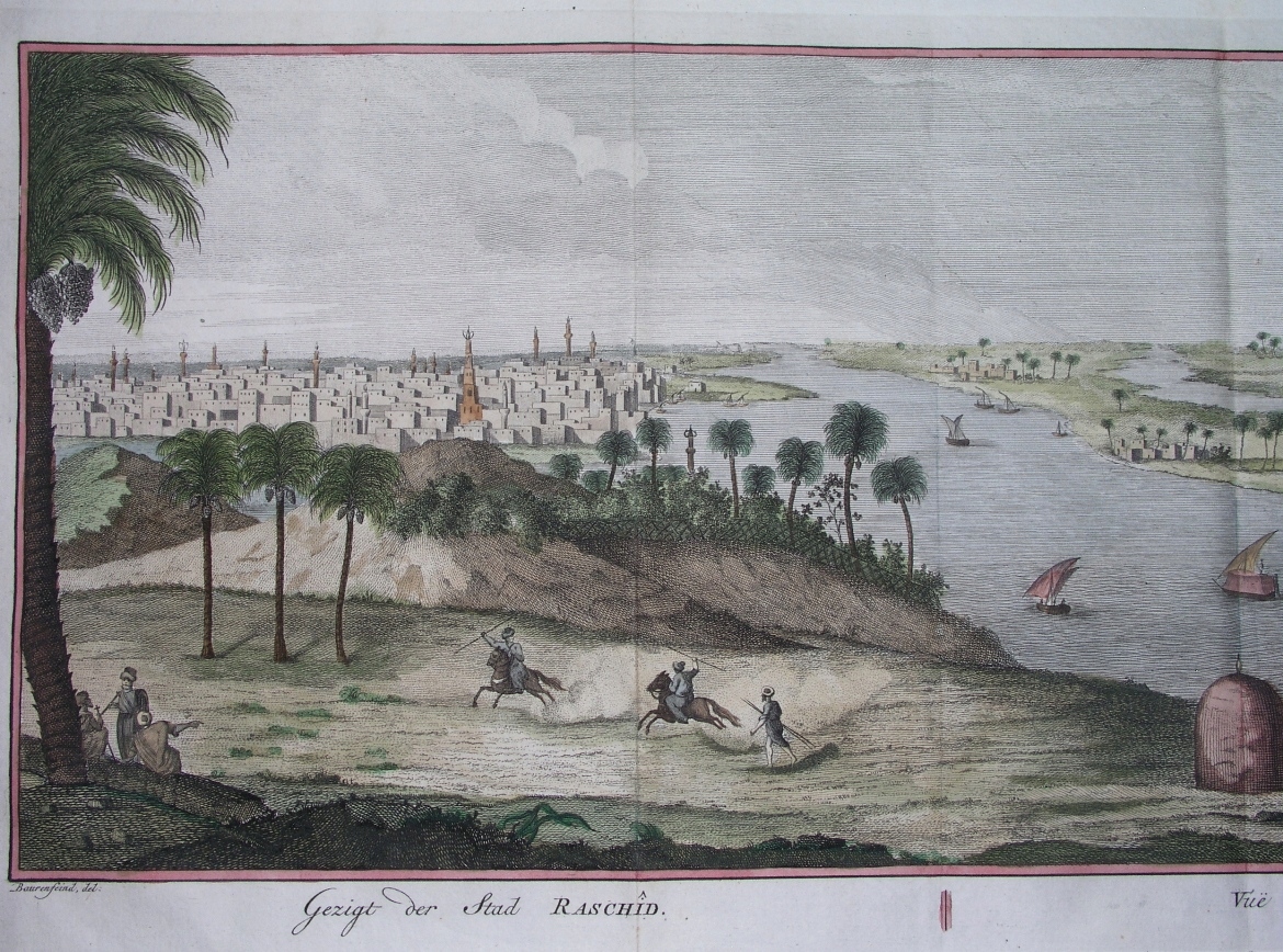 ДЕКОРАТИВНА, ОРИГІНАЛЬНА ГРАФІКА із зображенням міста Розетта в дельті єгипетського Нілу, з роботи Карстена Нібура під назвою "Voyage ne Arabie...", опублікованої S.J. Baalde and J. van Schoonhoven, Amsterdam and Utrecht 1776. Це розфарбована вручну гравюра на міді, чітко надрукована на аркуші ребристого паперу ручної роботи, складеному хрест-навхрест утричі; реверс без друку. З назвою голландською та французькою мовами та номером посилання "Baurenfeind del." і "C. Philips, Jz: Скульптури:". -----Розмір графіки приблизно 40 на 18 см, розмір аркуша приблизно 45 на 26 см.----- Дуже добрий стан (незначна зміна кольору паперу, складки, забруднення).