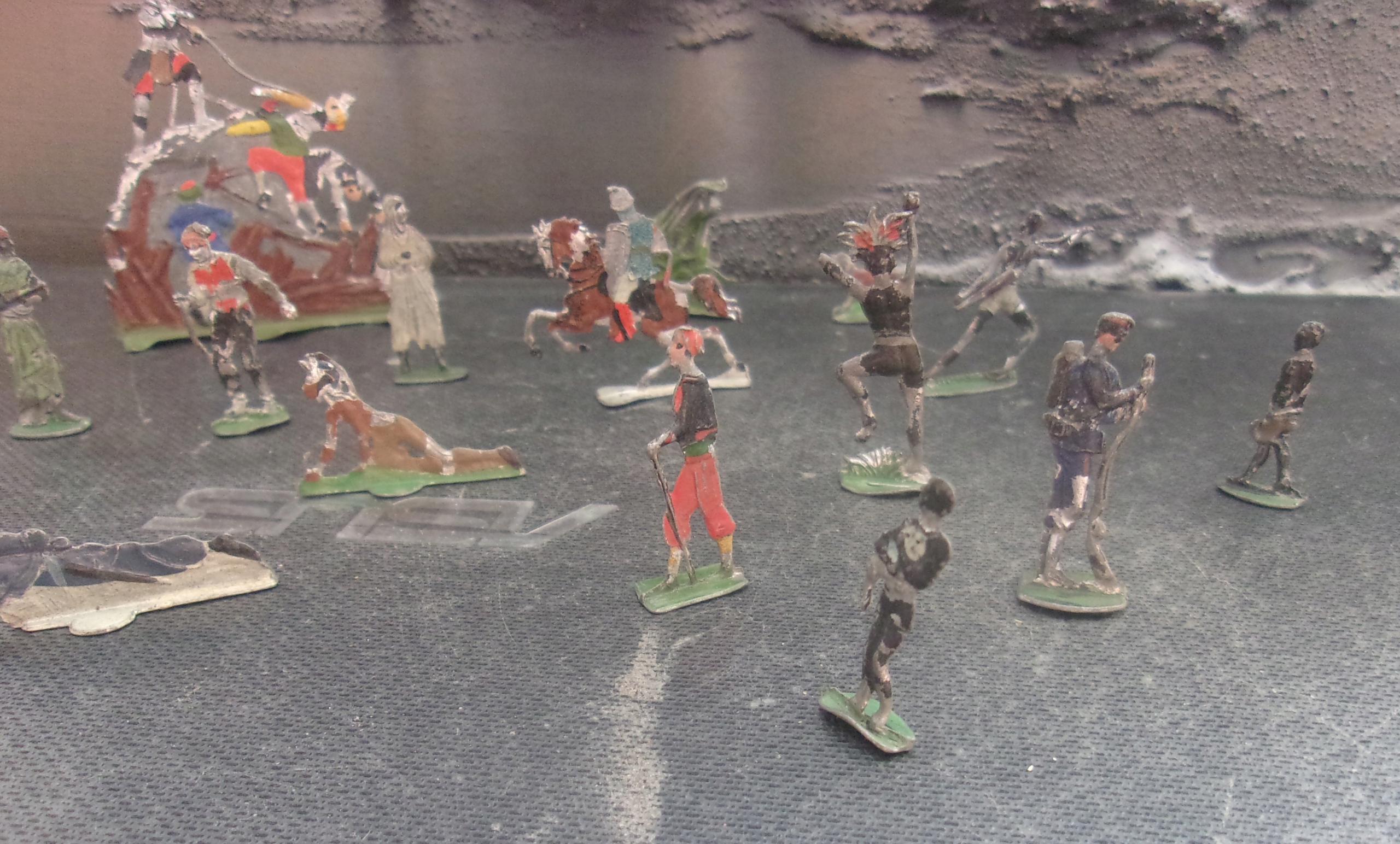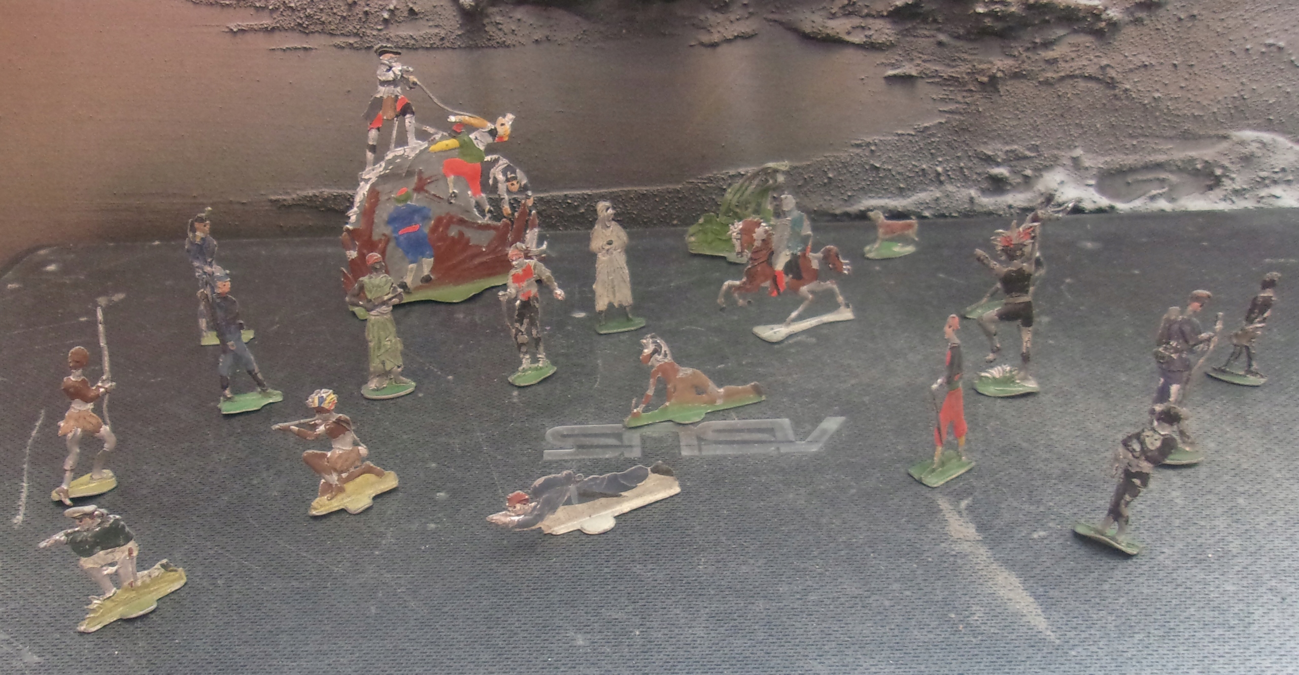 Фігурки зображують білих солдатів та індіанців, і серед них є одна тварина та одна фігура кущів
