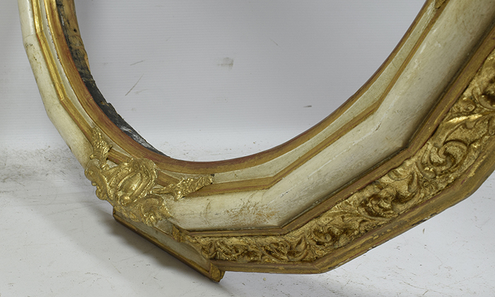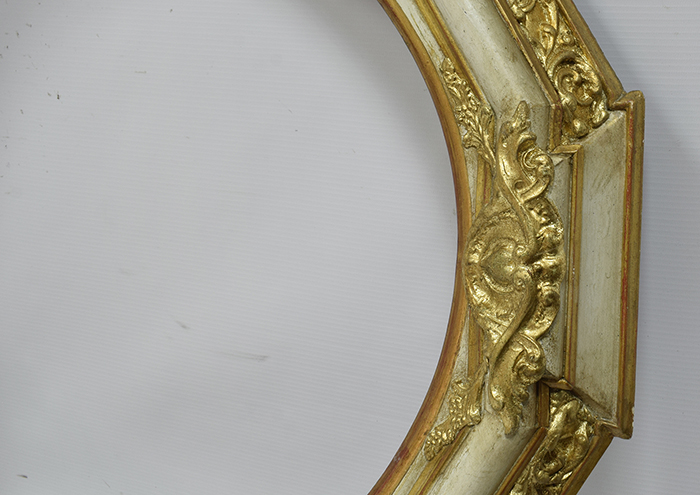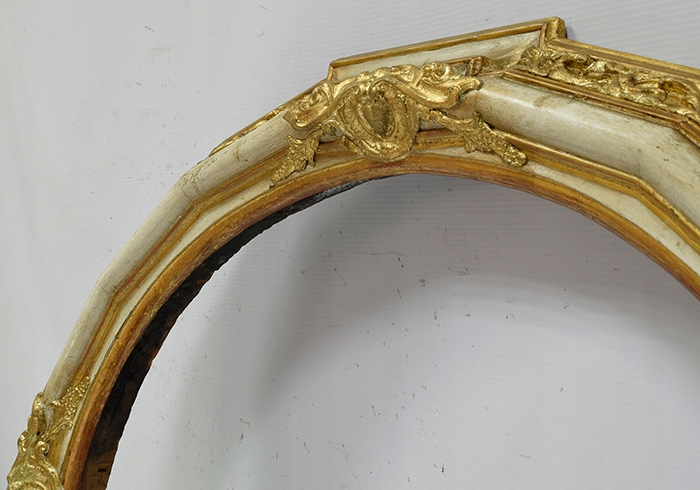 Стара декоративна овальна дерев’яна рама в оригінальному стані, частково вкрита шматками шлагметалу. До рами додано нові декори.