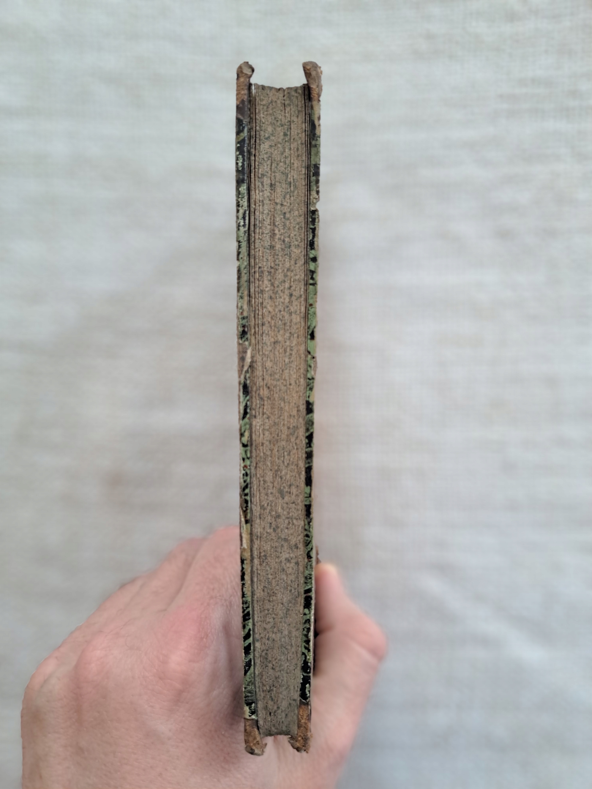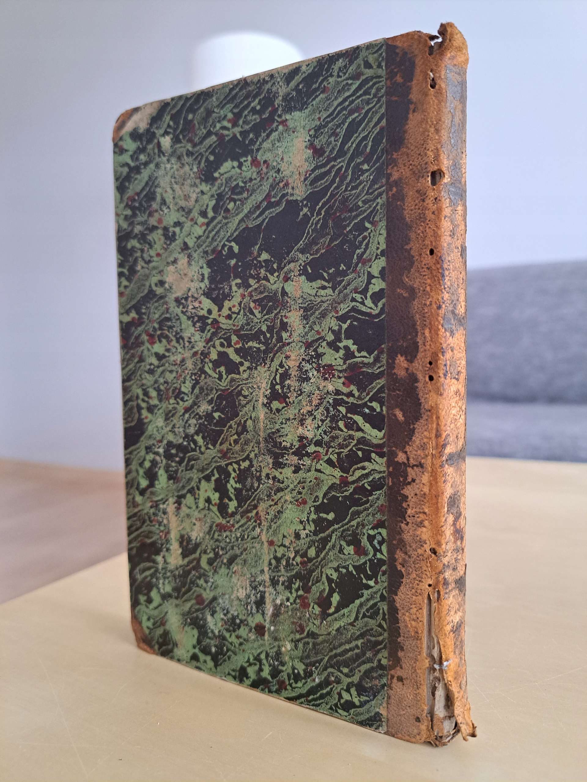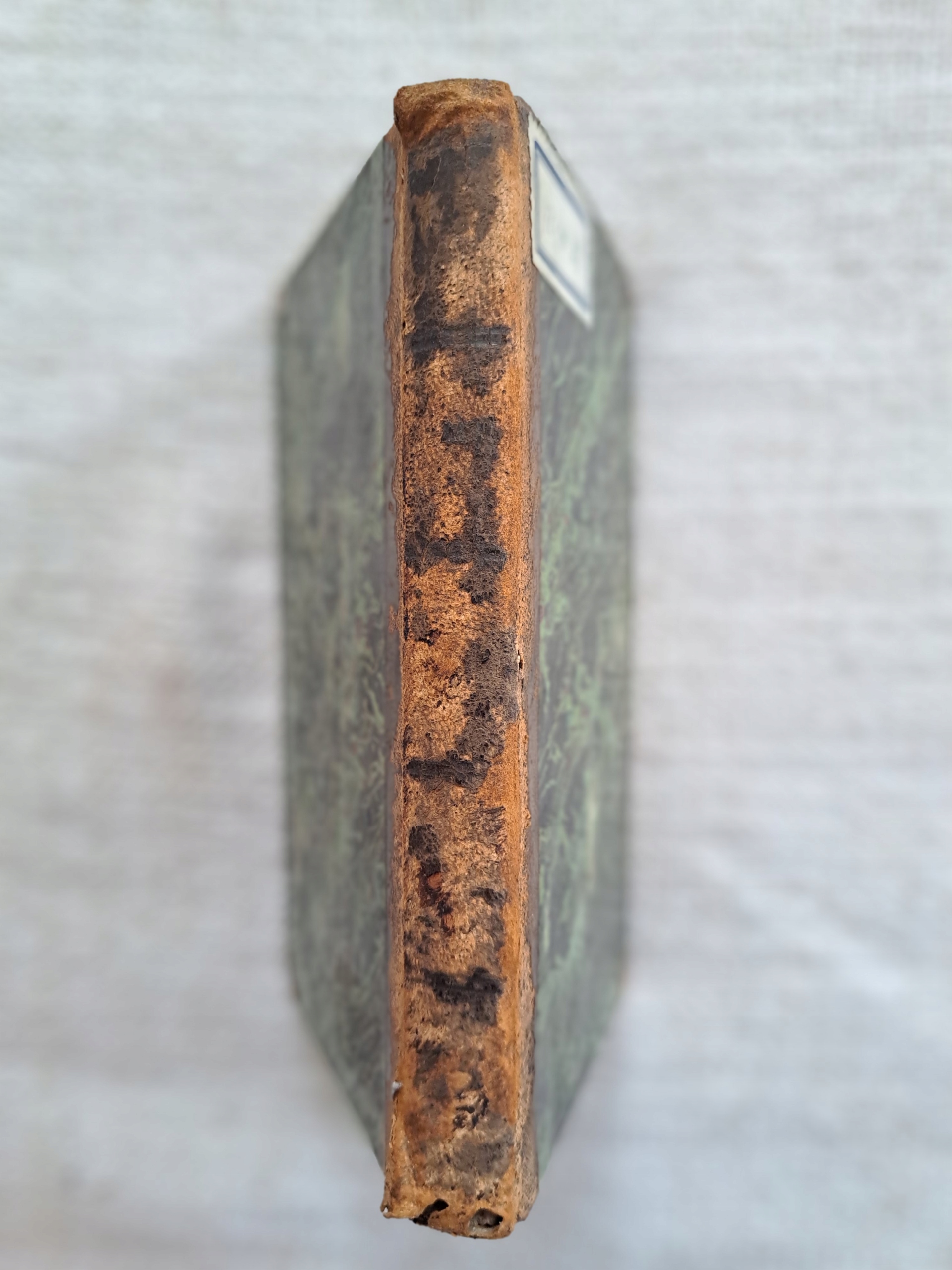 Стан: дуже добрий. Послідовний блок, сторінки знебарвлені з віком. Корінець в місці з'єднання з задньою кришкою внизу розірваний. Книга має штампи бібліотеки.