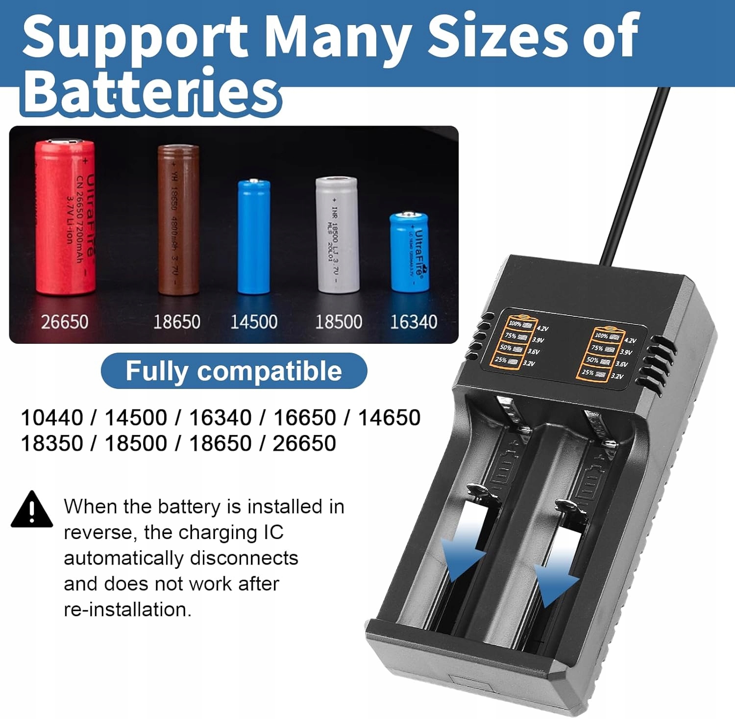 Універсальна сумісність: Зарядник акумулятора сумісний з широким діапазоном 3,6 В/3,7 В літій-іонних акумуляторів, включаючи 10440, 14500, 14650, 17500, 17670, 18350, 18500, 18650, 20700, 21700, 22650, 25500, 26500 та 26500 та 26500 та 26500.