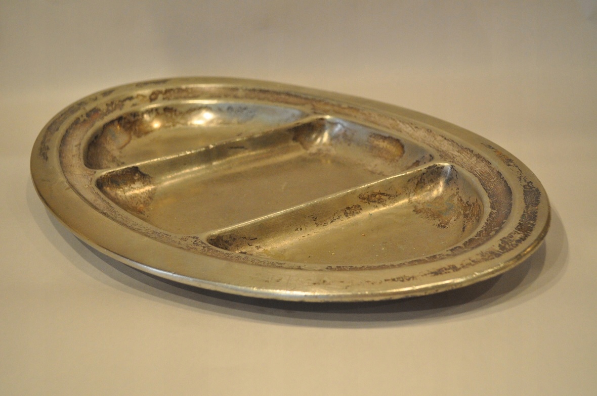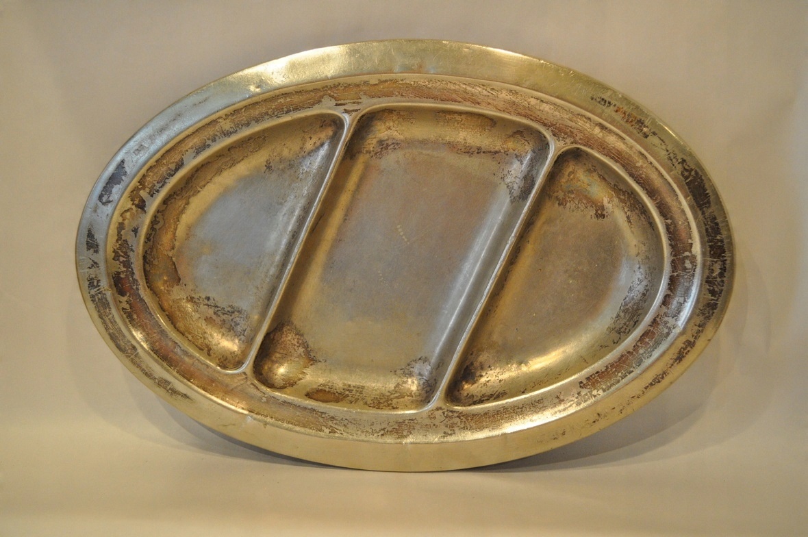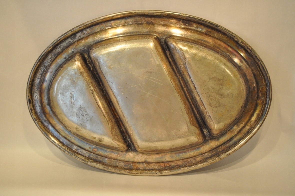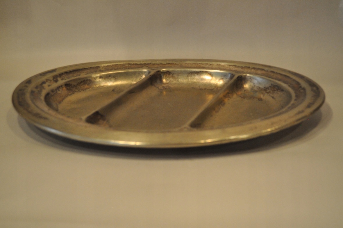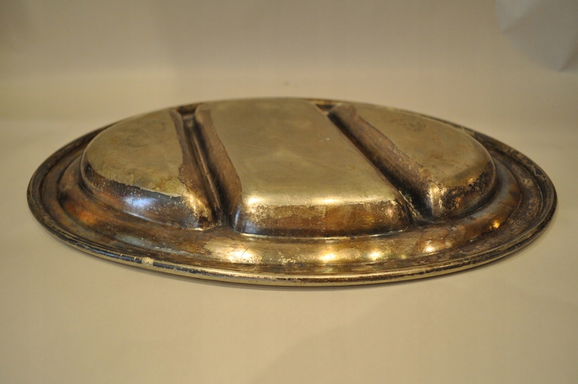 Блюдо має оригінальне срібне покриття з дрібним локальні плями, потертості / потертості.