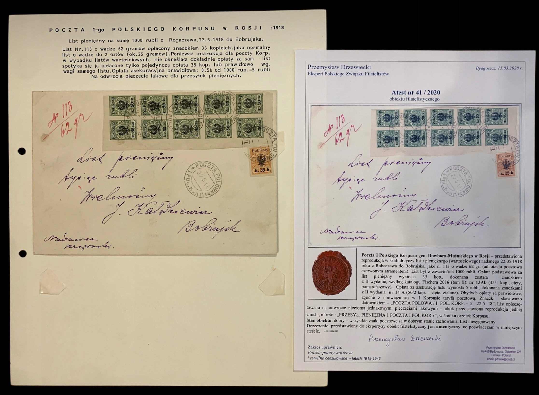 1918 Dowbór Muśnicki list wartościowy koperta atest Drzewiecki RRR