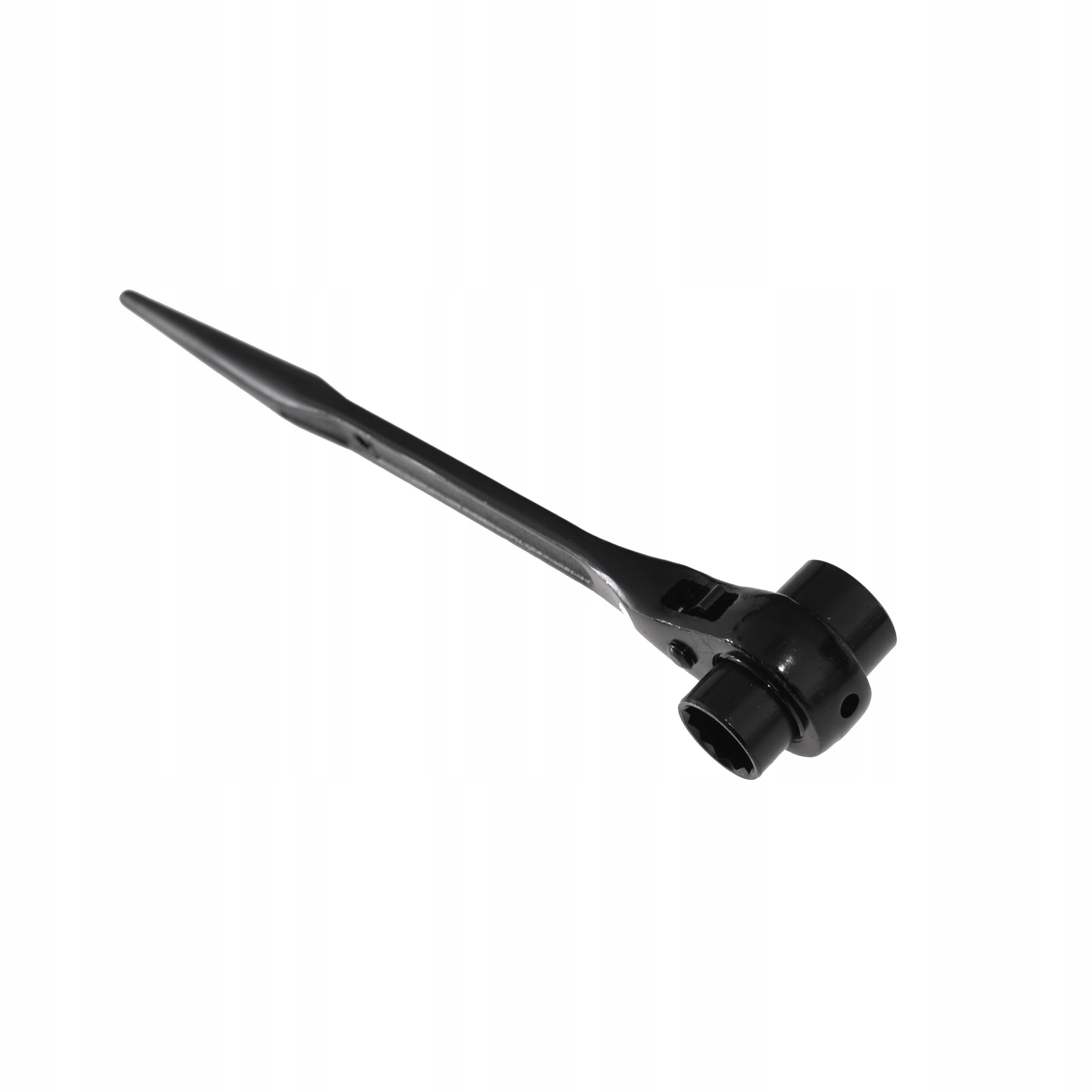 Універсальний професійний гайковий ключ для риштувань. Ідеально підходить для монтажу та демонтажу будівельних лісів. Виготовлений методом кування, загартований і оксидований. Стійкий до корозії ключ. Довге плече гайкового ключа дозволить відкрутити застряглі з'єднання. Загострений наконечник допоможе підчепити і розсунути демонтовані елементи. Гайковий ключ оснащений перемикачем напрямку храповика вліво/вправо. Завдяки отвору в ручці його можна прикріпити та закріпити під час роботи на висоті.