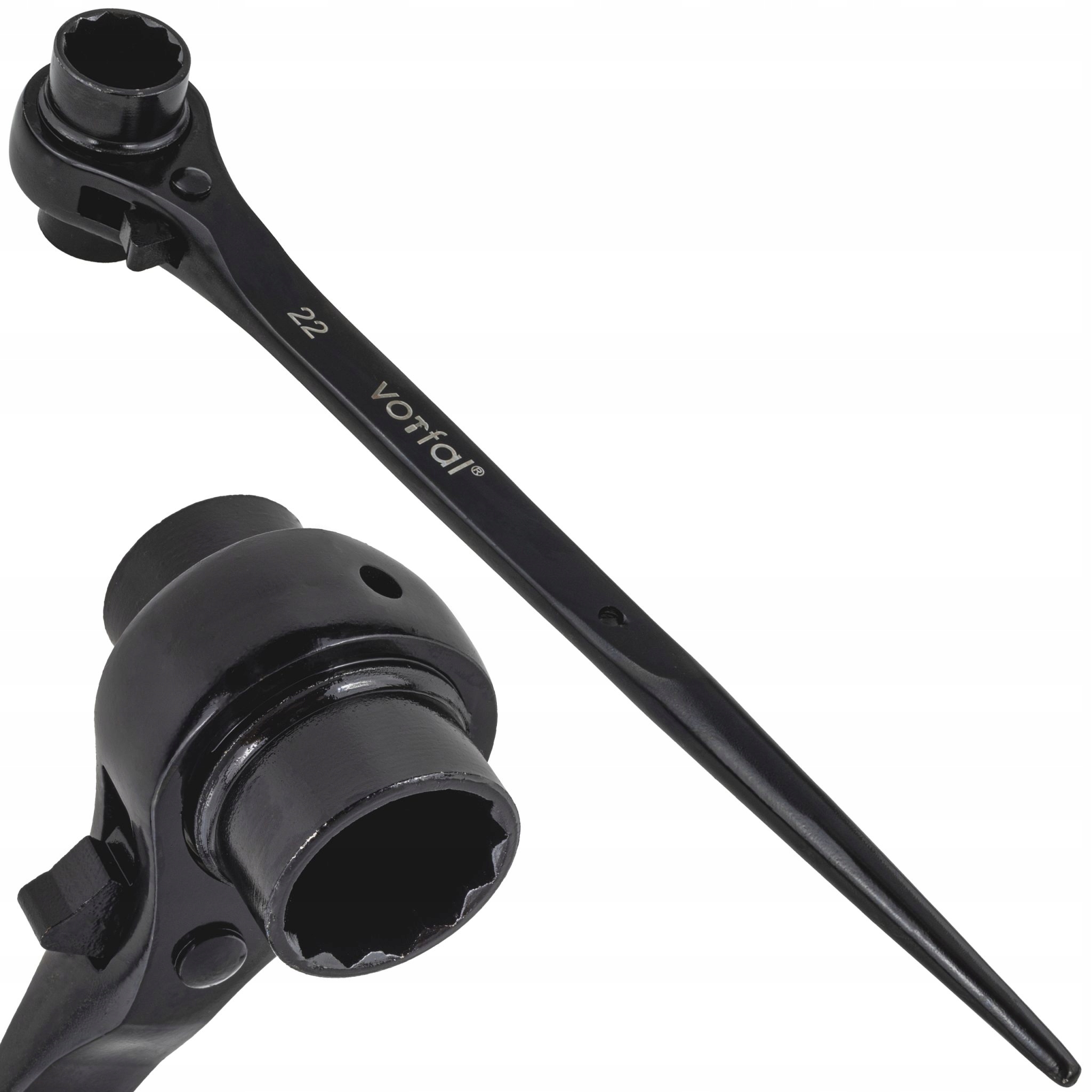 Універсальний професійний ключ для монтажу будівельних лісів. Ідеально підходить для монтажу та демонтажу будівельних лісів. Виготовлений методом кування, загартований і оксидований. Стійкий до корозії ключ. Довге плече гайкового ключа дозволить відкрутити застряглі з'єднання. Загострений наконечник допоможе підчепити і розсунути демонтовані елементи. Гайковий ключ оснащений перемикачем напрямку храповика вліво/вправо. Завдяки отвору в ручці його можна прикріпити та закріпити під час роботи на висоті.