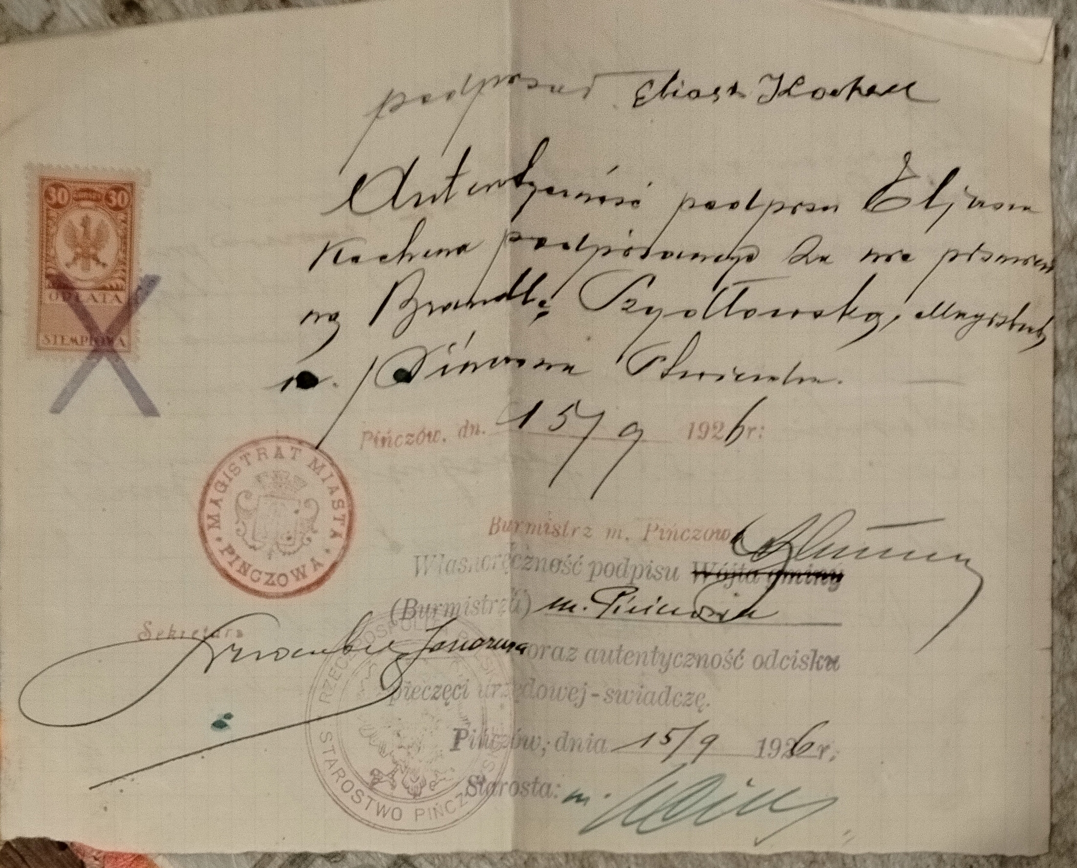 Брандла Шидловська зобов'язується зберігати отримані в посилці речі лише для власного використання та нікому нічого з отриманої посилки не передаватиме - її підпис нижче текст. Під текстом на другій стороні аркуша підписи бурмістра Пінчува та кругла печатка магістрату Пінчува з гербом у центральній частині. Крім того, кругла печатка з емблемою Пінчівського повітового управління та підписом старости від 15 вересня 1926 року. Погашена гербова марка номіналом 30 грошей. Формат 22 х 17,5 см, хороший стан, слід складання по вертикалі. [PIŃCZÓW] [ПАЛЬТО][ŚWIĘTOKRZYSKIE] [II RP][JUDAICA]2910D