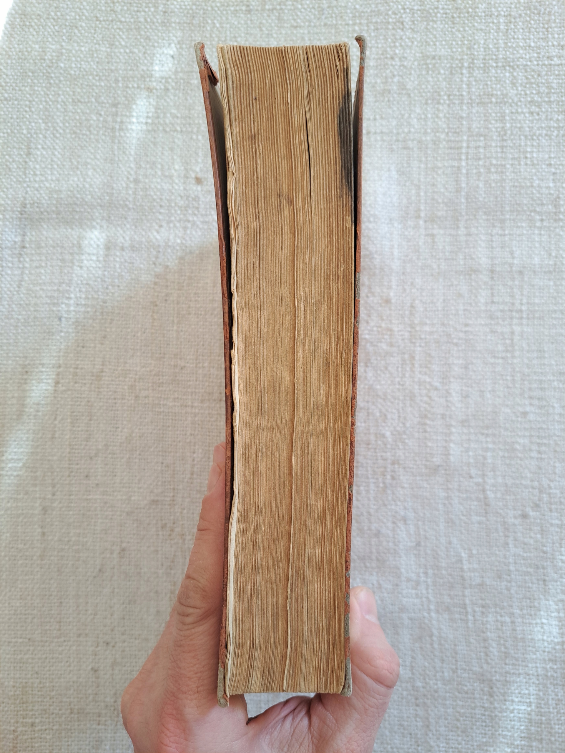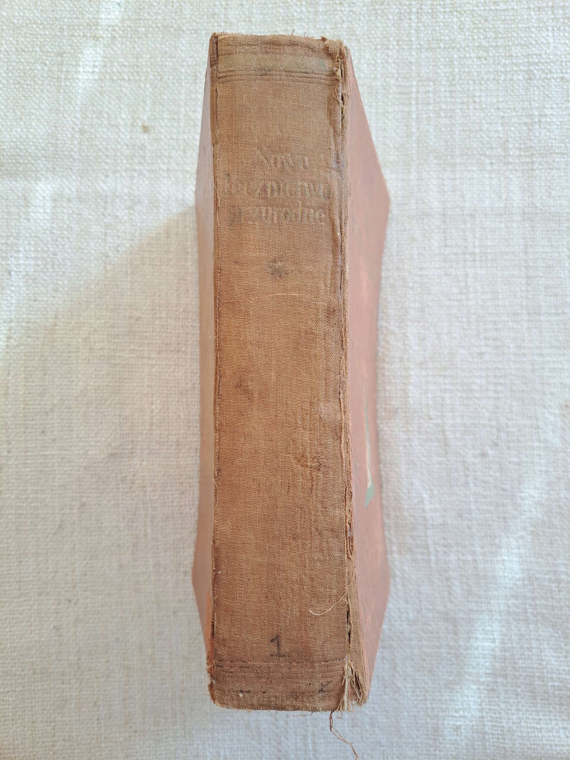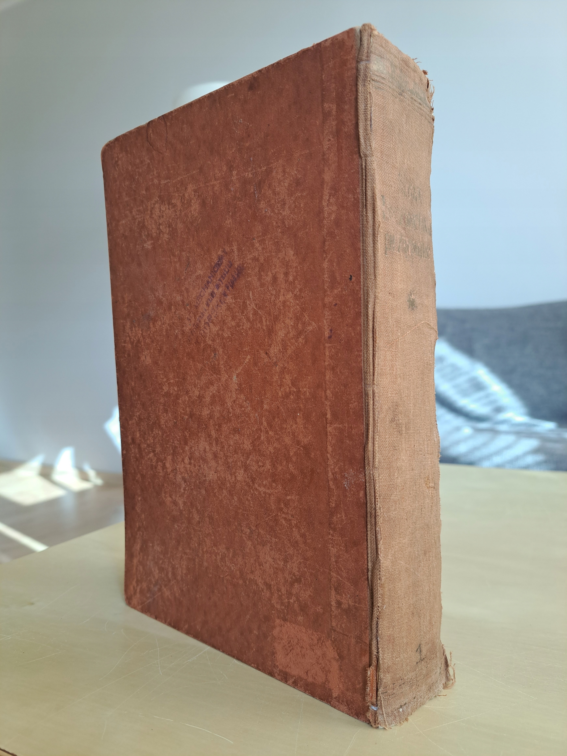 Стан: добрий. Послідовний книжковий блок. У деяких місцях сторінки знебарвлені через старіння. Перев'язка між обв'язками і хребтом розірвана. У книзі є марки.