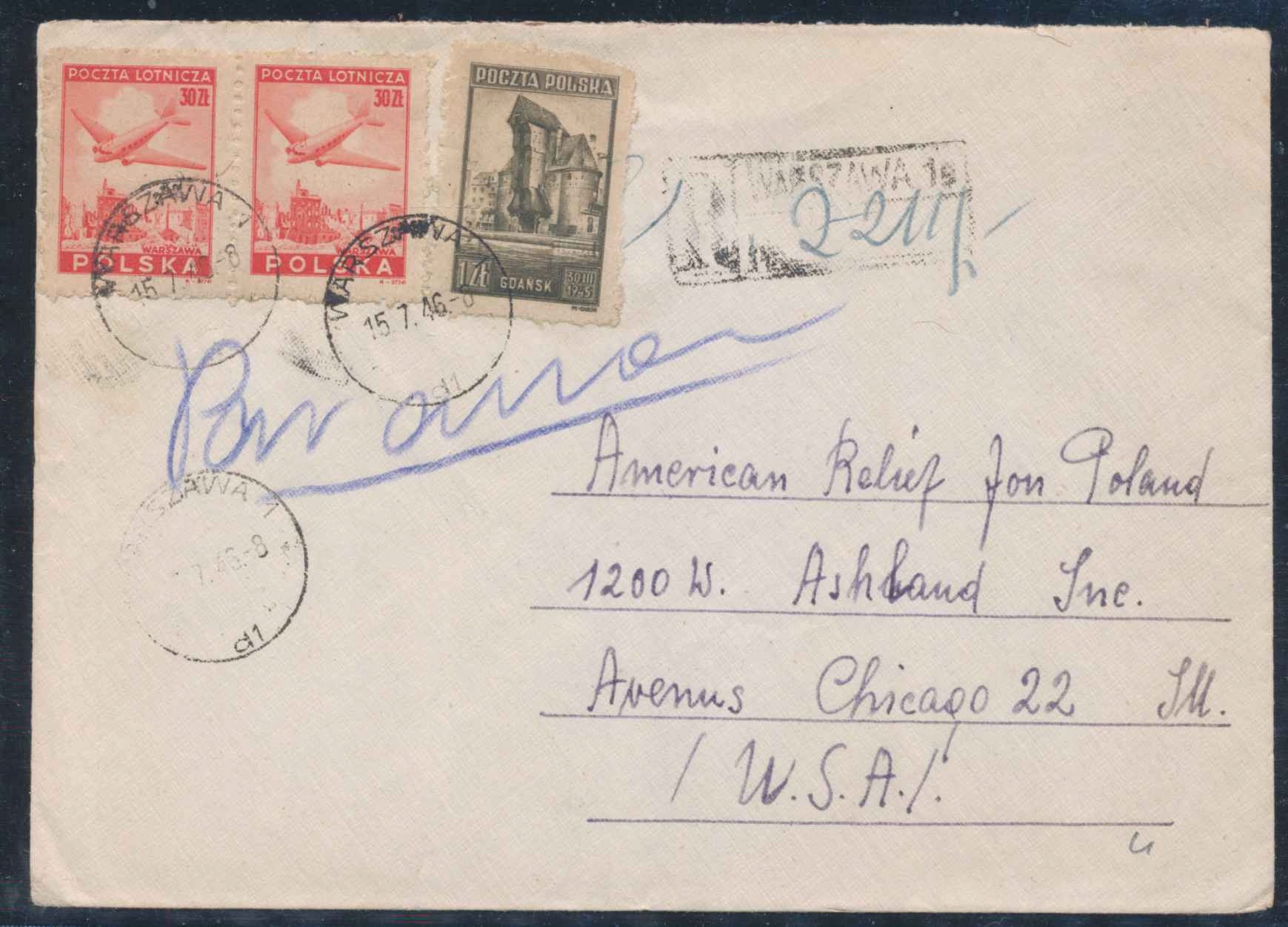1946 НАРОДНА ПОЛЬЩА, авіапоштовий конверт, рекомендований R-WARSZAWA 1 до Чикаго, США, змішана франкатура 61 злотий. Вартість доставки 10 злотих. Пріоритетний рекомендований лист. REGIONALIA, МАЛА БАТЬКІВЩИНА - ВАРШАВА. ТЕМИ - АВІА ПОШТА, ІНФЛЯЦІЯ.