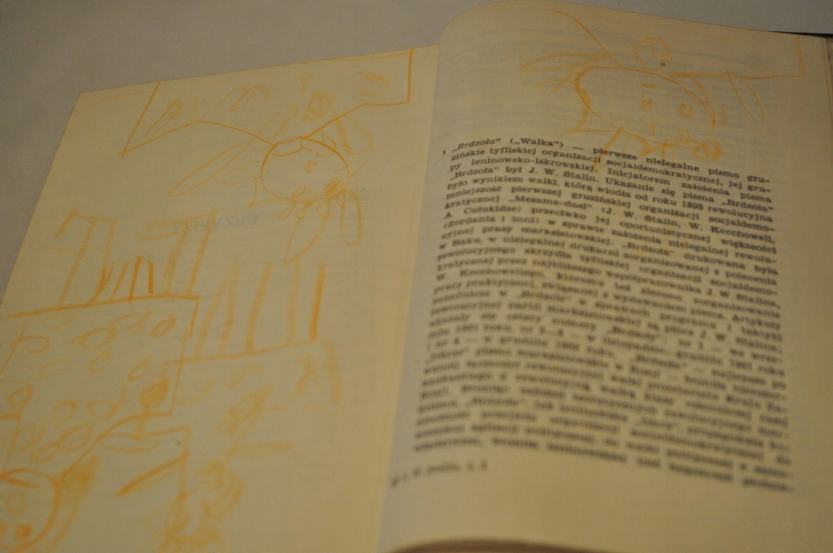 Багато каракулів олівцем на форзаці та на картках у блоці.