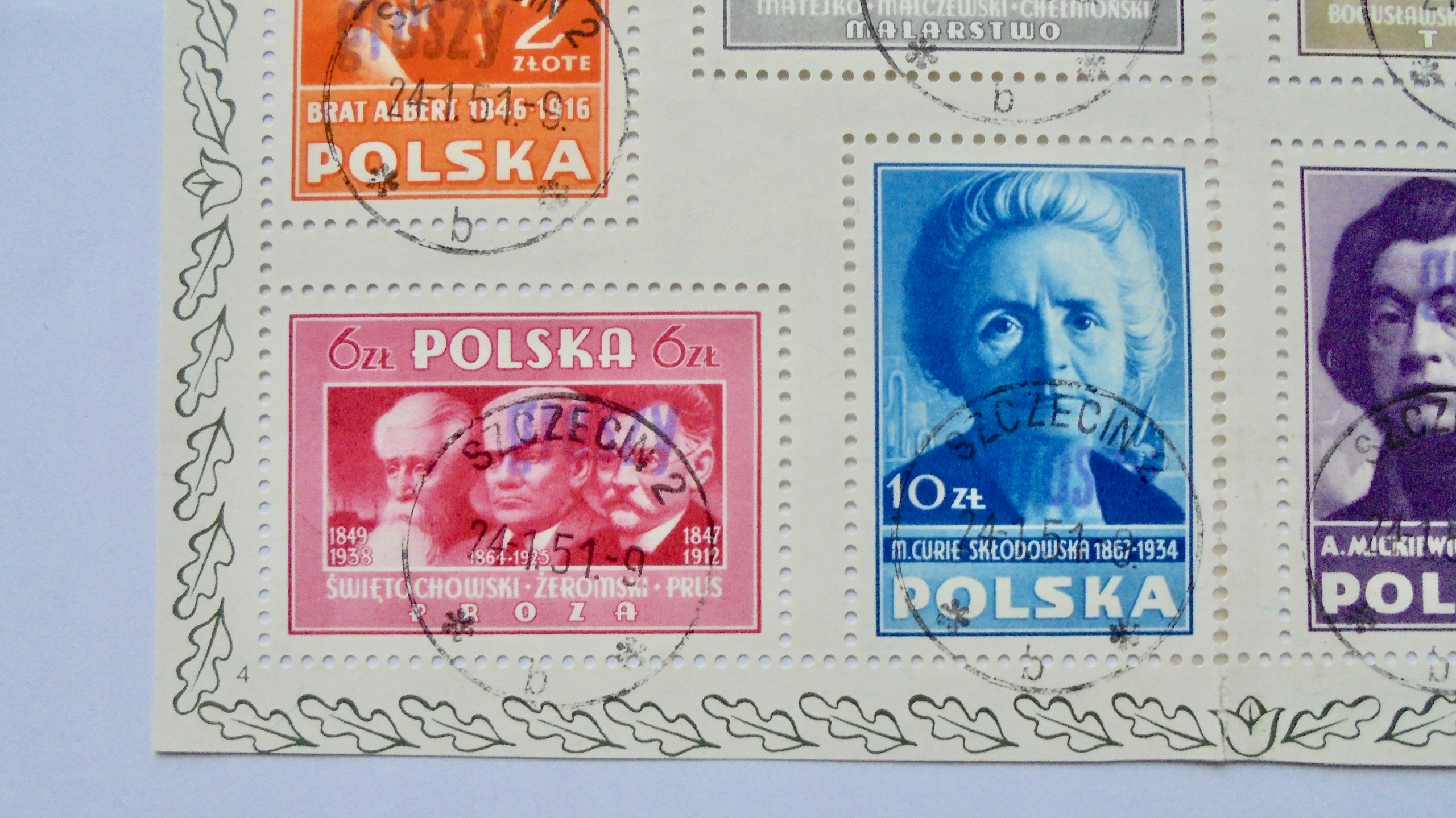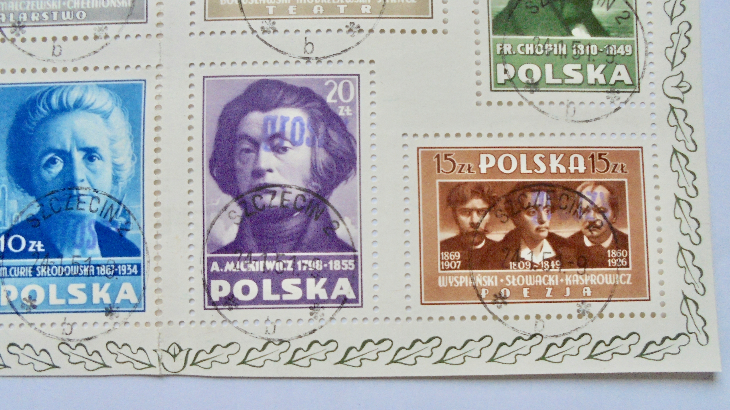 1950 Polska blok KULTURA Fi.10 kasowany z nadrukiem GROSZY, gwarancja