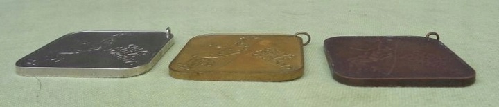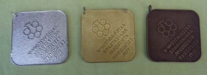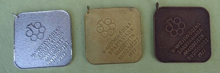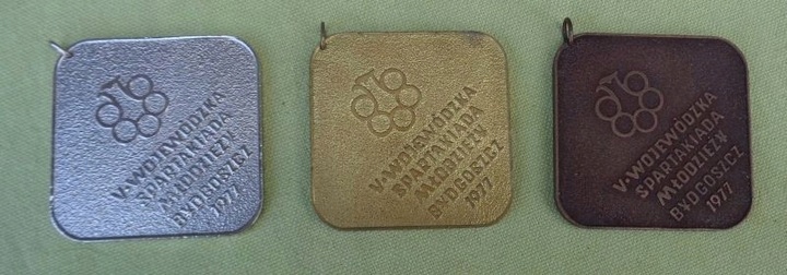Три оригінальні спортивні медалі: бронзова, срібна та золота, якими були нагороджені учасники V обласної спартакіади молоді, що проходила в Бидгощі в 1977 році. Експонати мають цікаву квадратну форму. З одного боку медалі є символ польського спорту та напис, який повідомляє, під час якого спортивного змагання були вручені медалі, з іншого боку – фігури двох бігунів і латинська фраза. Золота медаль виготовлена з позолоченого металу, срібна медаль – з посрібленого металу. Експонати мають оригінальну вішалку. Медалі поміщені в оригінальний футляр. Рекомендую колекціонерам та іншим.