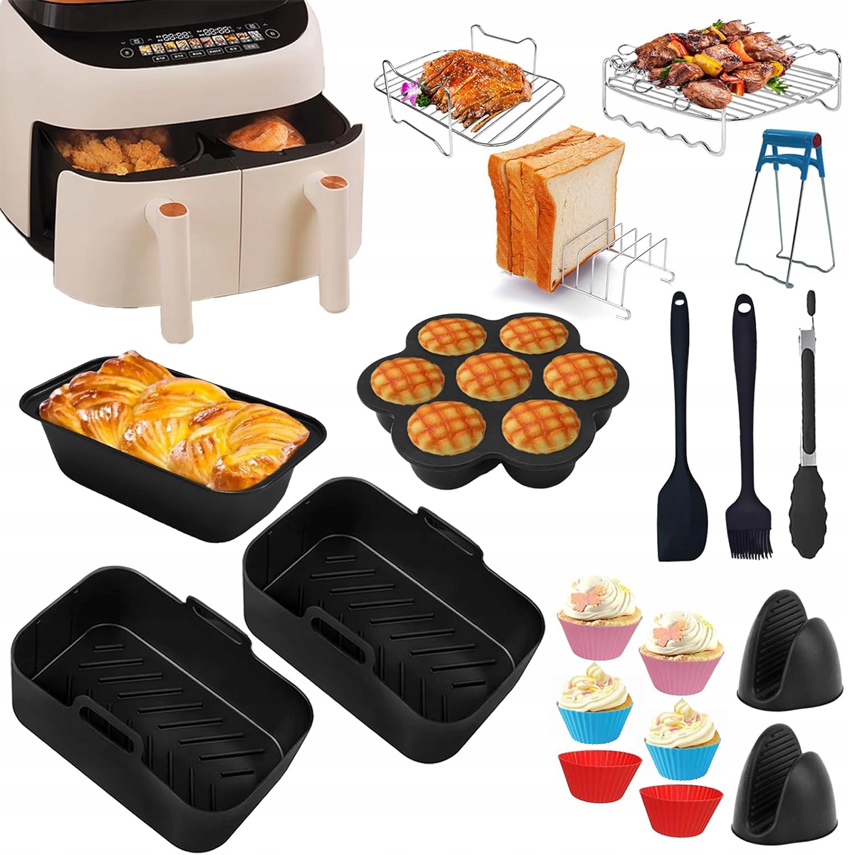 ✨ ✨awier 2 силіконові вставки, 1 косирна решітка, 1 сушіння, 1 випічка, 1 форма торта, 6 чашок для кексів, 1 силіконові цвілі, 1 пудри, 1 кухонні рукавички та кухонні рукавички. Повний набір аксесуарів для повітря -фриджа підходить для 99% страв, приготованих у цьому пристрої!