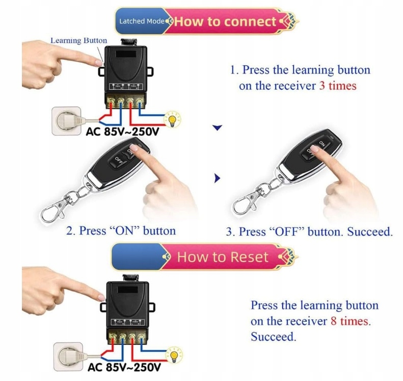 Після успішного спарювання в цьому режимі натисніть кнопку дистанційного керування (наприклад, A), реле приймача, що відповідає A, буде включена; Натисніть іншу кнопку дистанційного керування (наприклад, B), реле на приймачі, що відповідає A, буде вимкнено, а приймач, що відповідає B, буде включена, реле буде відкритим. Натисніть третю кнопку пілота (наприклад, C), приймач вимкнеться. (Примітка: У цьому режимі рекомендується використовувати пульт дистанційного керування з трьома або більше кнопок).