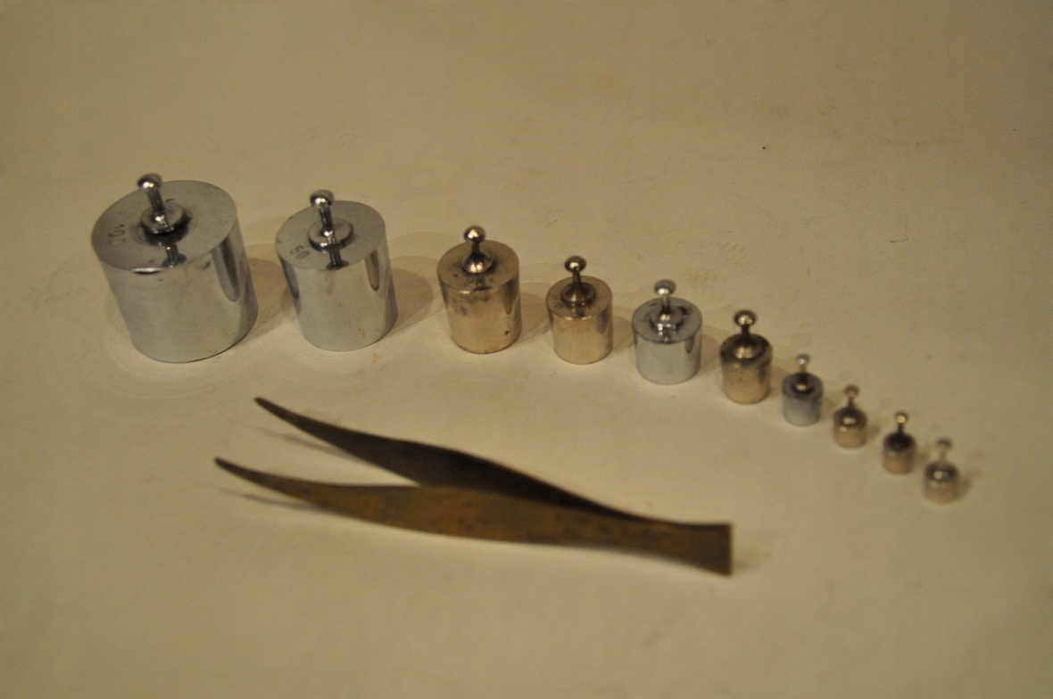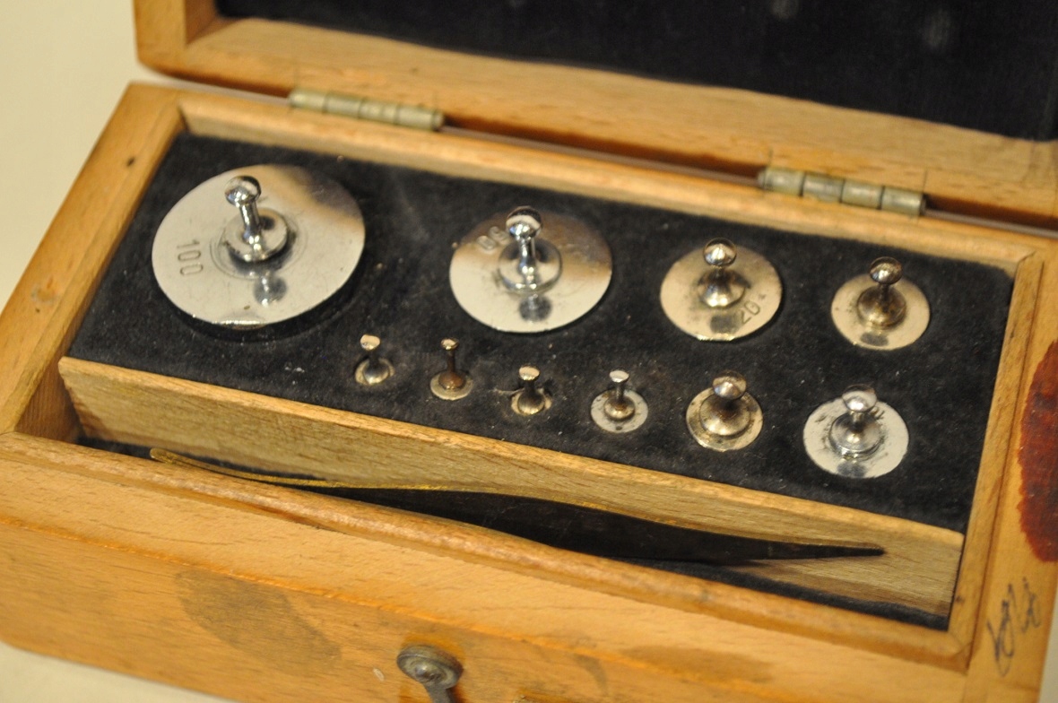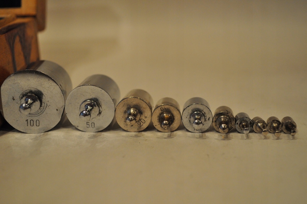 Комплект прецизійних (*) гир лабораторних в дерев'яному футлярі.