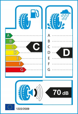 Оцінка зчеплення вказує на те, наскільки добре шина працюватиме на мокрій поверхні, і її продуктивність оцінюється за шкалою від A до G. Рейтинг A вказує на короткий гальмівний шлях на мокрій поверхні.