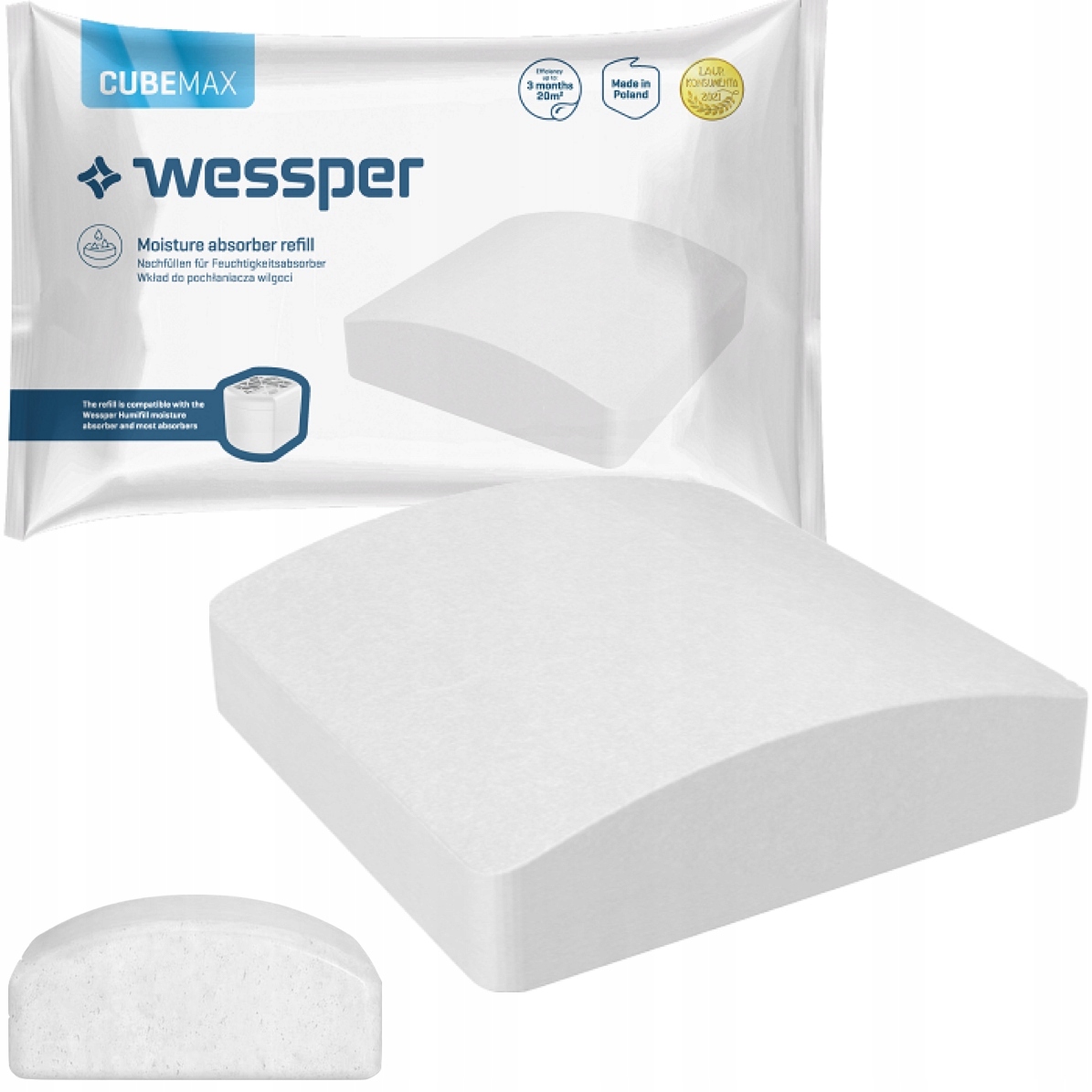 Планшет Wessper CubeMax призначений для більшості доступних на ринку поглиначів вологи, включаючи Wessper Humifill. Ефективно працює в приміщеннях площею до 20 м2 протягом 3 місяців після розпакування в залежності від вологості повітря та температури приміщення.