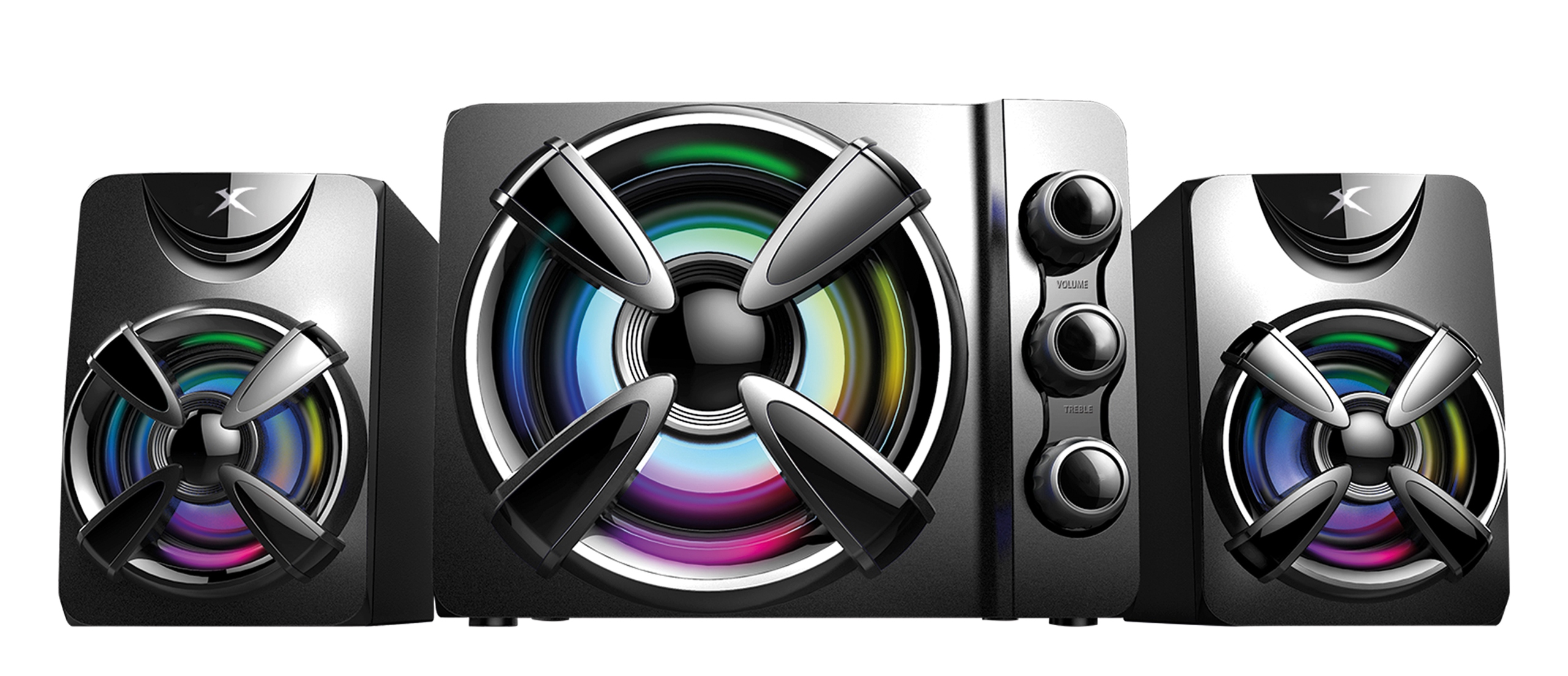 Удосконалений дизайнерський ігровий набір, оснащений динаміками потужністю 2x3 Вт і сабвуфером потужністю 5 Вт, що створює ефект об’ємного звучання. Високоякісний низькочастотний динамік, що входить в комплект, забезпечує чистий і чистий звук. Розміщені на ньому потенціометри спрощують роботу з набором навіть для новачків. Набір особливо сподобається людям, які захоплюються іграми. Атмосферне освітлення під час ігор забезпечують світлодіоди, оснащені основним динаміком і двома сателітами.