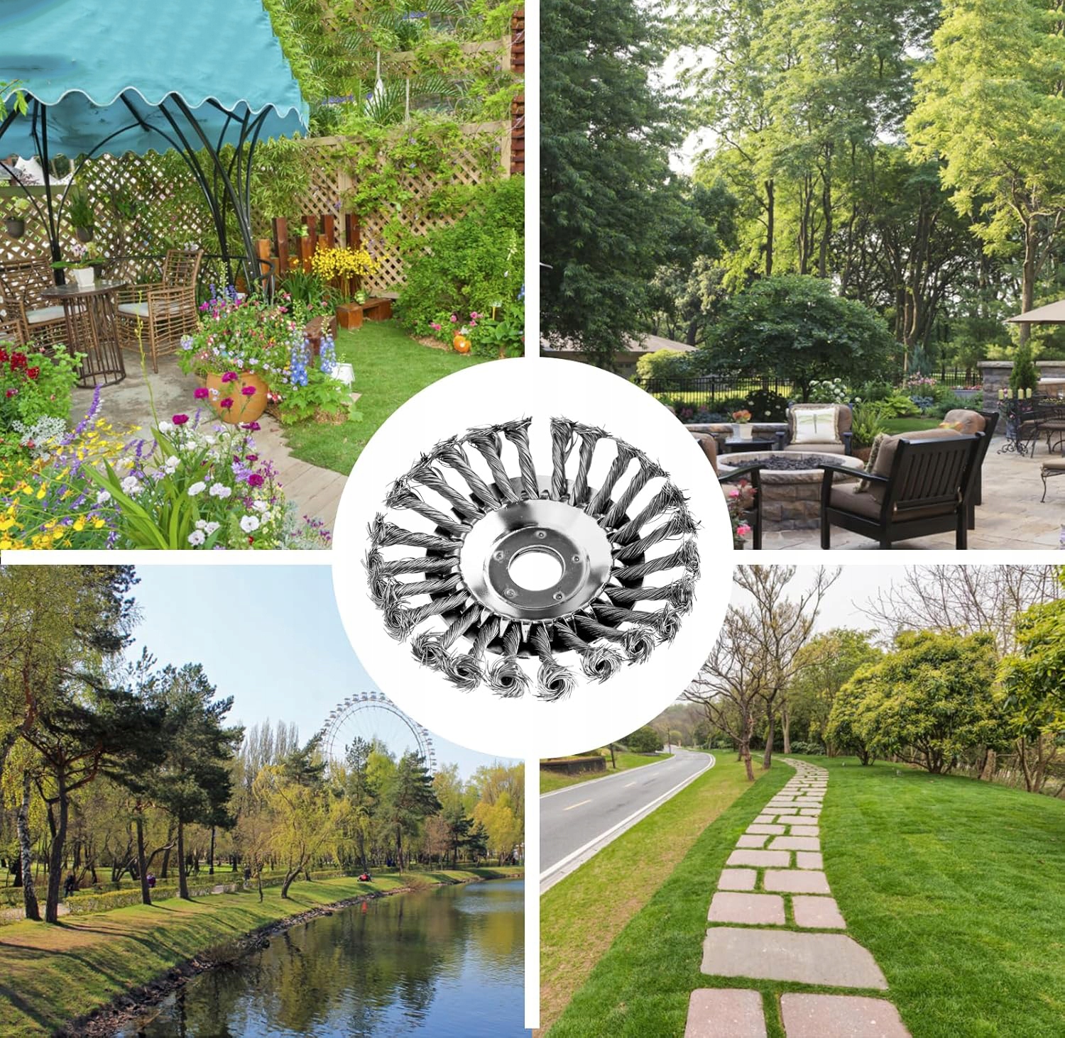 ☑ 【Нова щітка бур’янів】 Кисть для видалення бур’янів, виготовлена з високоякісного сталевого дроту. Порівняно з багатьма іншими щітками з бур’янами, було додано нові отвори для позиціонування, щоб запобігти переміщенню дроту під час використання. Він має сильніші, стабільніші та безпечніші властивості. Як нитка, що повертається вліво, і тиск виготовлені з нержавіючої сталі і дозволяють прямій старт. Це забезпечує відмінну стійкість до стирання та зносу та високого ефекту згинання і все ще добре працює, коли голова тримера потрапляє в каміння та грудочки. Це суттєво покращує ефективність роботи. Орди, нержавіючі залізні пластини.