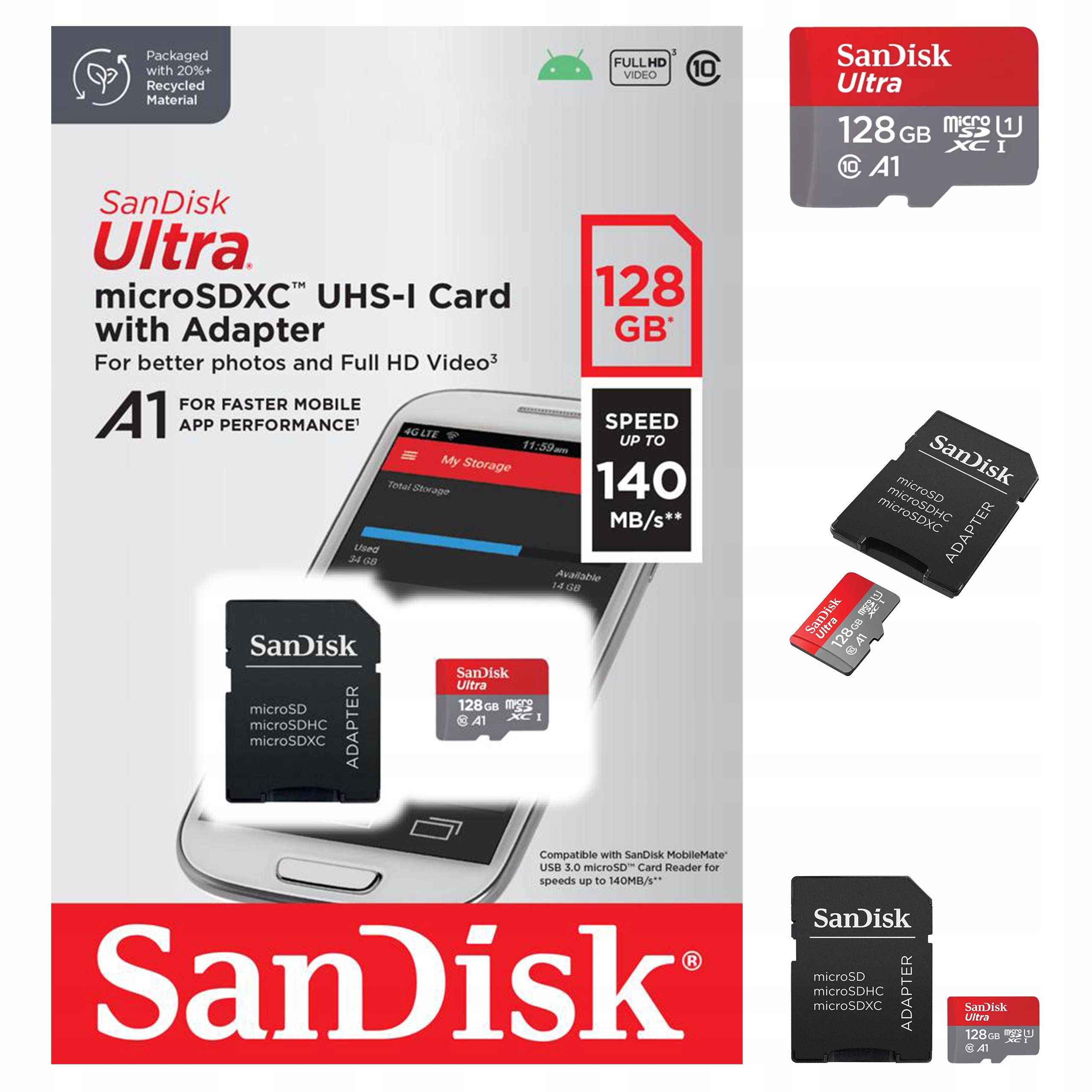 2 -кратна карта пам'яті 128 ГБ Sandisk Ultra - MicroSD XC UHS -1 Клас 10 140 Мб/с.