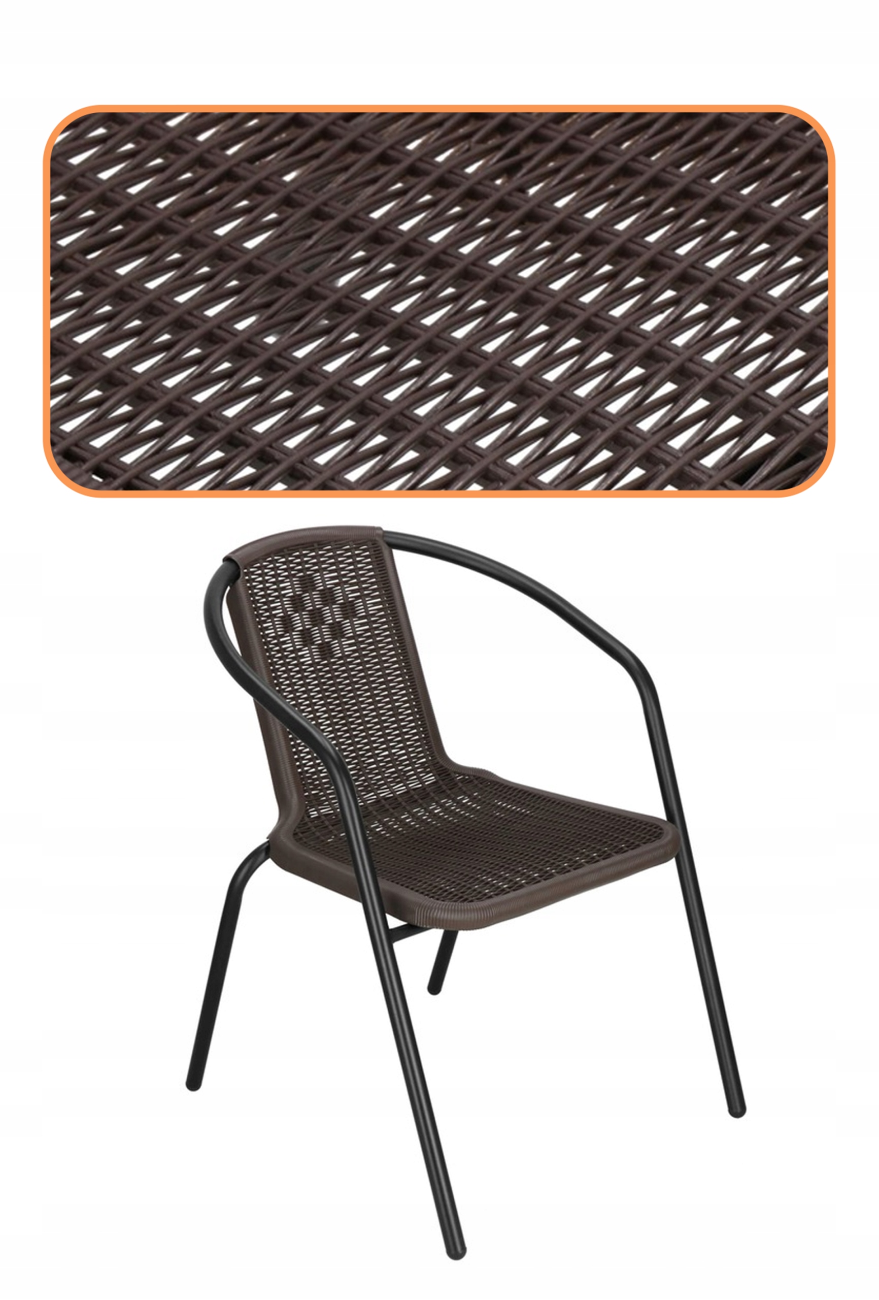 Продукт має металеву чорну раму та сидіння з спинкою, створеною з пластику, що імітує ротанг.