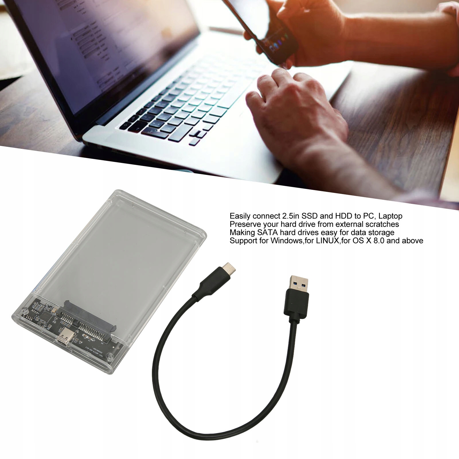 3. Система підтримки: адаптер корпусу зовнішнього жорсткого диска підтримує Windows, LINUX, OS X 8.0 і вище. Розроблено для 2,5-дюймових жорстких дисків SATA 7 мм/9,5 мм і SSD до 2 ТБ.