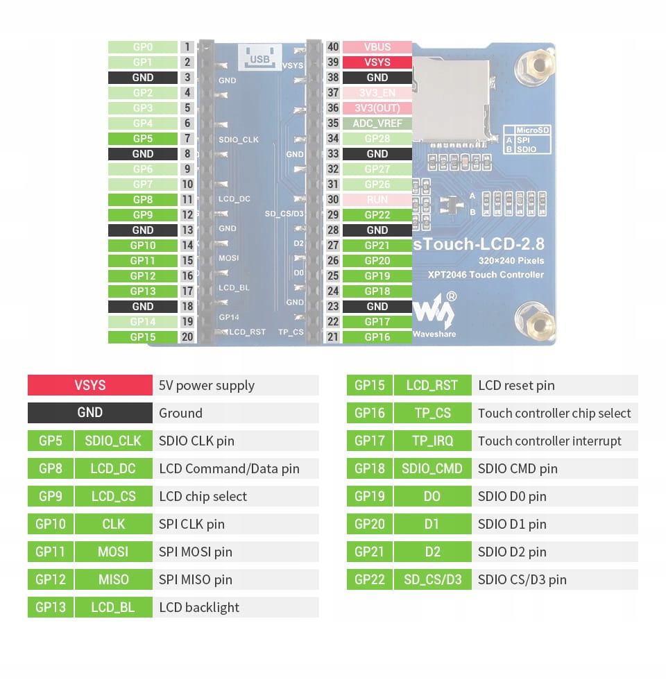 2,8-дюймовий сенсорний дисплейний модуль для Raspberry Pi Pico, 262 тис. кольорів. Дисплей з роздільною здатністю 320×240, 262K кольорів. Резистивний сенсорний контролер XPT2046, контролер ST7789 з використанням шини SPI.
