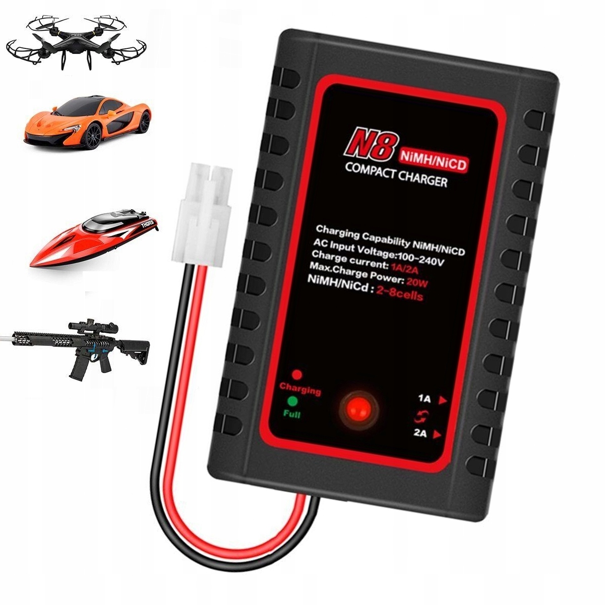 【Розумний зарядний пристрій NiMH】Зарядний пристрій N8 NiMH професійно розроблено для заряджання акумуляторів NiMH/NiCD на 2–8 секунд (2,4–9,6 В) у дронах/автомобілях на радіоуправлінні/човнах із радіоуправлінням/зброї для страйкболу. Інтелектуальна зарядка із захистом від перезаряду, безпечна та ефективна.