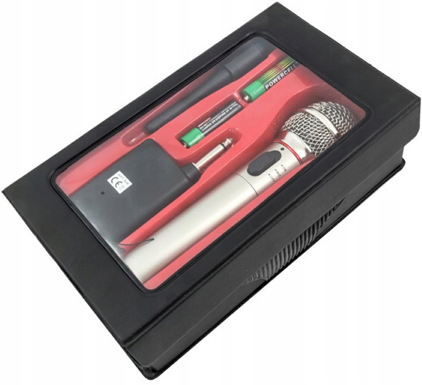 - У набір входить: 2x бездротовий мікрофон, 2x антена, 2x кабель із роз’ємом, 2x приймач із роз’ємом, футляр