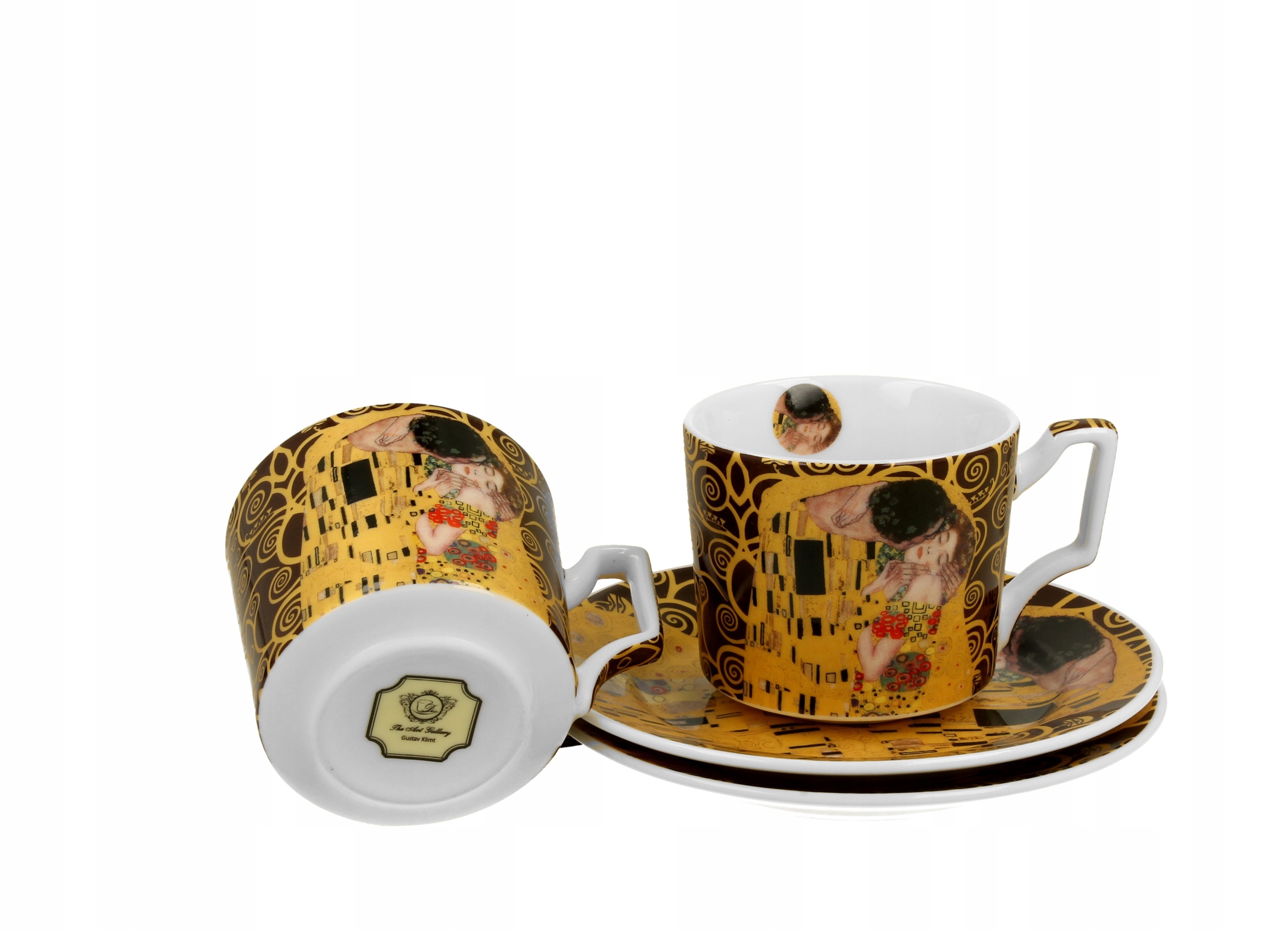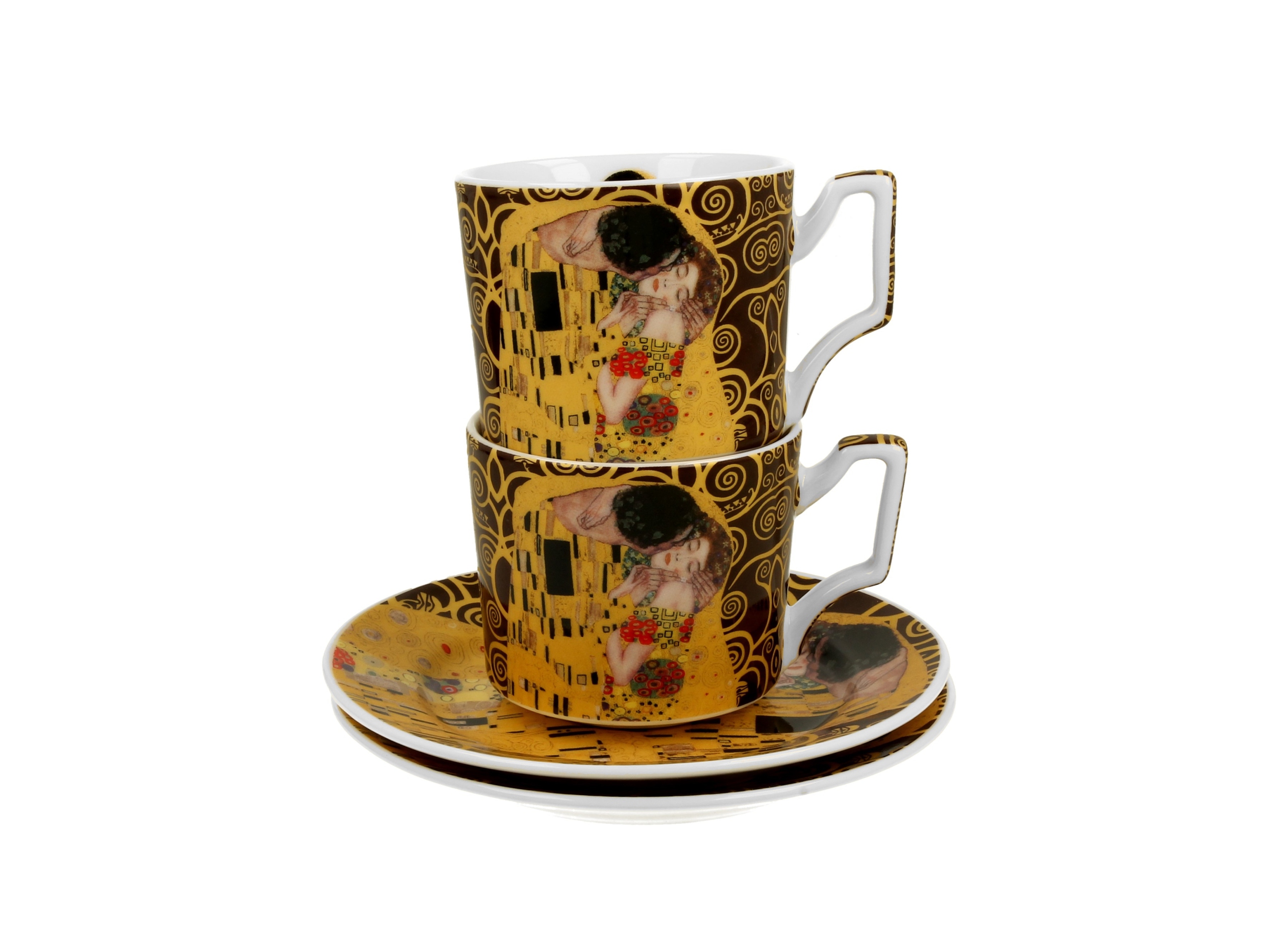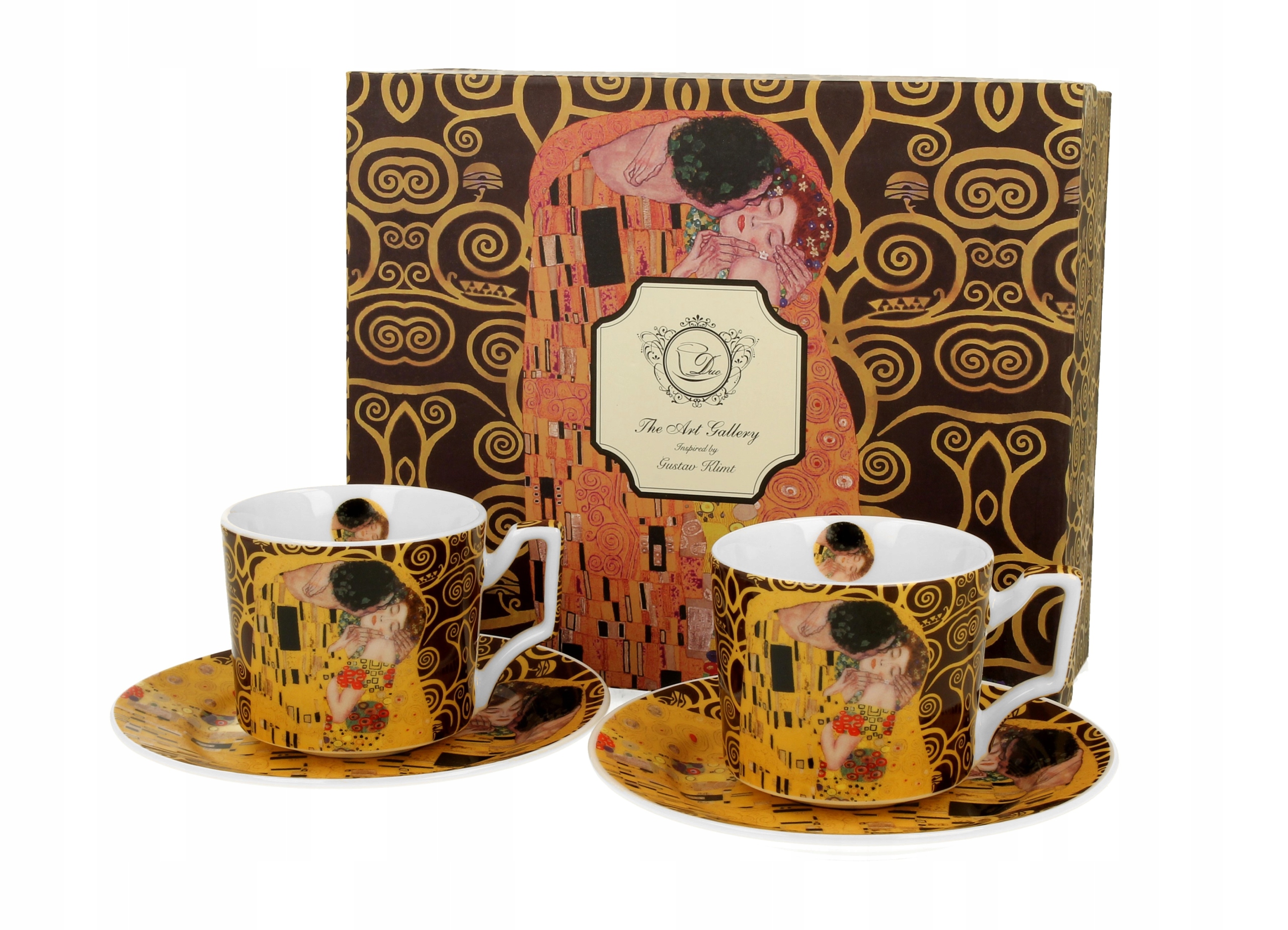 Набір із двох розкішних чашок для еспресо 110 мл із блюдцями THE KISS BROWN від Густава Клімта, частина серії Art Gallery, виготовлена з порцеляни New Bone China, що характеризується елегантним і природним кремово-білим кольором з ніжним блиском, а також виняткову довговічність .