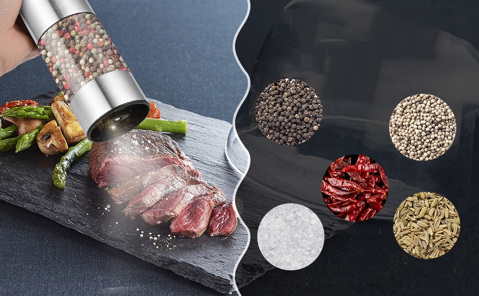 ☑️Цей продукт підходить для всіх видів спецій. Подрібнювач може перетворювати майже всі типи спецій у частинки відповідного розміру: від морської солі, високоякісної кристалічної солі та перцю до екзотичного перцю чилі. Товщина частинок регулюється відповідно до різних смакових уподобань. Обертання за годинниковою стрілкою робить їх дрібнішими, а обертання проти годинникової стрілки робить їх більш грубими. Кожне уподобання має свій унікальний смак. (Примітка: великі матеріали слід спочатку подрібнити, перш ніж додавати в м’ясорубку)