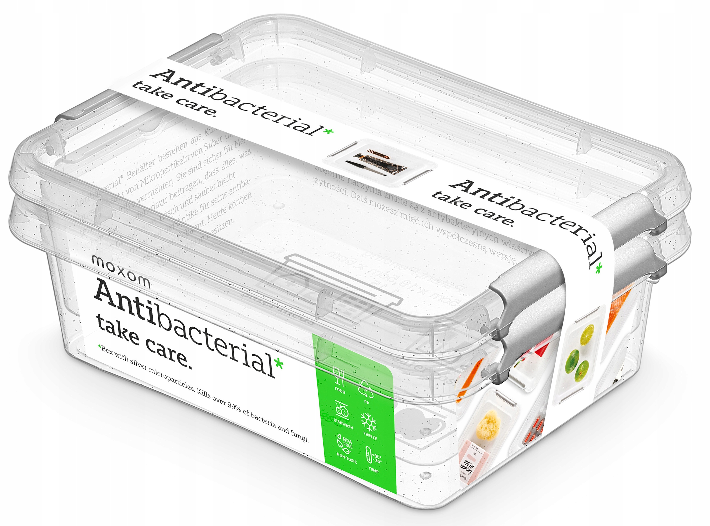 Антибактеріальний контейнер для зберігання продуктів та іншого. Завдяки частинкам мікросрібла, розміщеним по всьому контейнеру, воно допомагає зберігати їжу свіжою та пригнічує ріст бактерій і грибків.