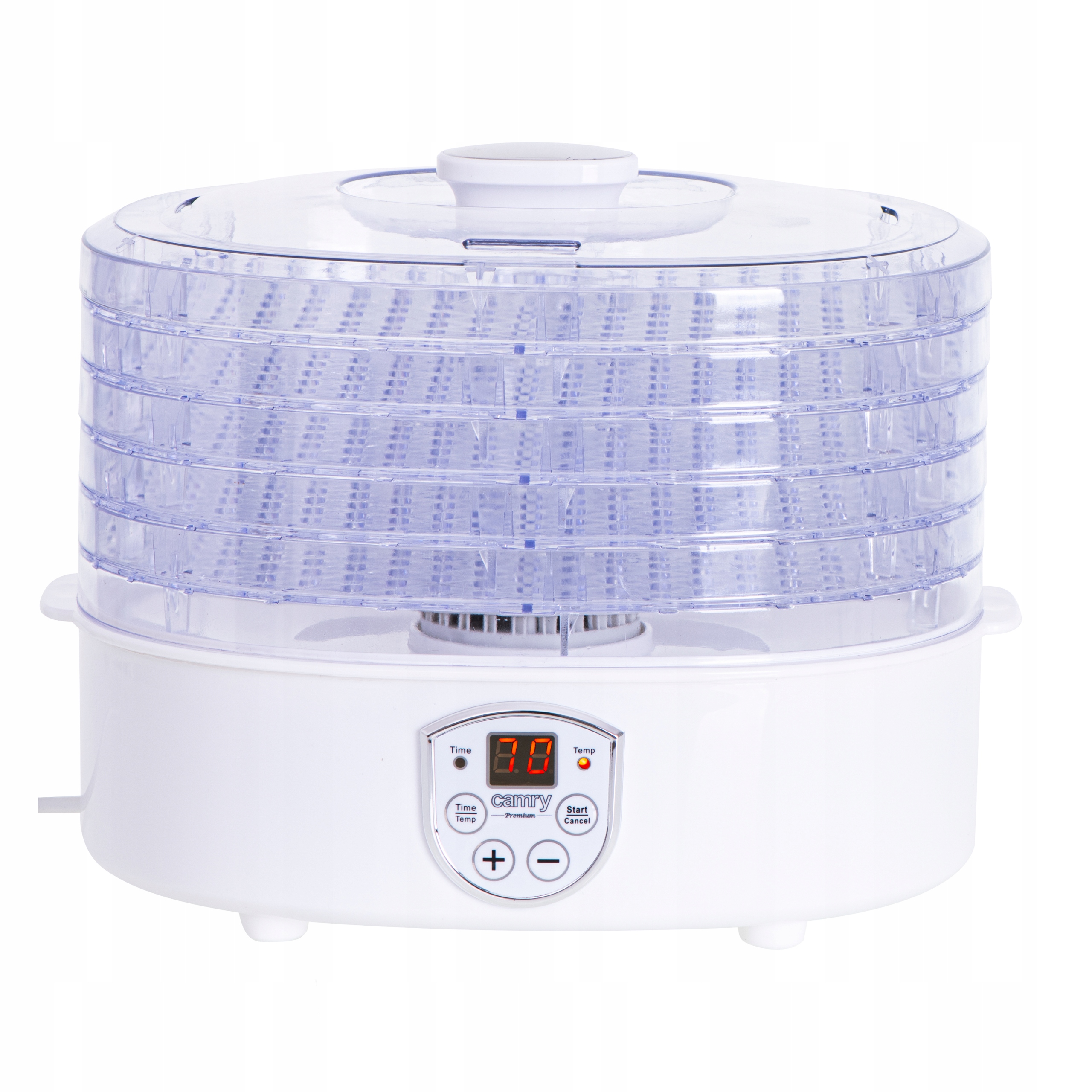 Практичні гриби, трави та продукти з силою 550 Вт. Ви можете висушити гриби, овочі, фрукти та трави в ньому, завдяки тому, що їх легше зберігати і не руйнуватися. Сушарка працює тихо і не заважає виконанню домашніх заходів. Великі сита дозволяють розмістити значну кількість невеликих продуктів. У той же час, дворічна прокладка шарів вирішує, що пристрій не займає багато місця. Завдяки дворумовому контролю температури сушіння можна здійснити з різною інтенсивністю. Для безпеки сушарка оснащена системою захисту від перегріву, яка при необхідності автоматично вимикає пристрій. Пристрій оснащений 5 лотками, рівномірно розподіленими для кращої циркуляції повітря. Висота лотка - 3 см. Використовуючи панель управління з РК -дисплеєм, розміщеним на передній частині машини, ви можете встановити температурний діапазон інтересу та робочий час сушарки. Дегідратор оснащений таймером, завдяки якому ви можете встановити його роботу в діапазоні від 1 до 70 годин.