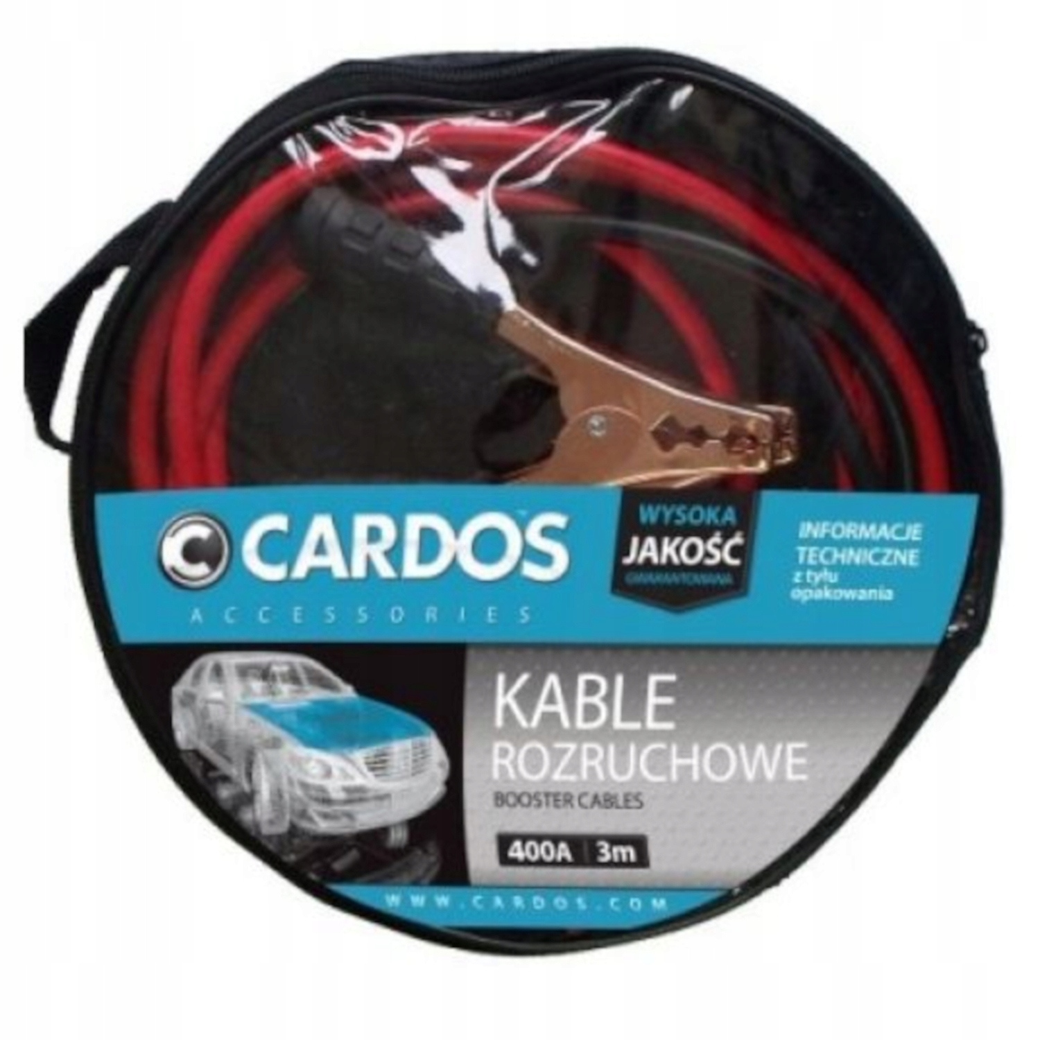 Тільки поєднавши ці елементи, проблеми із запуском автомобіля не зіпсують вам день, і ви зможете швидко їхати. Якщо ви хочете захистити себе від подібних ситуацій, переконайтеся, що в багажнику вашого автомобіля є якісні з’єднувальні кабелі. Професійні джемперні кабелі CARDOS - це високоякісні мідні дроти, призначені для забезпечення найкращої електропровідності та швидкого запуску автомобіля. Призначений для зарядки з максимальним струмом 400 А, оснащений міцними, покритими міддю для кращої провідності - затискачами, з широким захопленням, із зубцями, що забезпечують міцний і безпечний затиск на штирі акумулятора. Довжина кабелів 3 метри забезпечує зручне підключення до іншого автомобіля та аварійний запуск двигуна. Завдяки їм вам не доведеться максимально наближатися до машини, навіть якщо акумулятор знаходиться в багажнику.