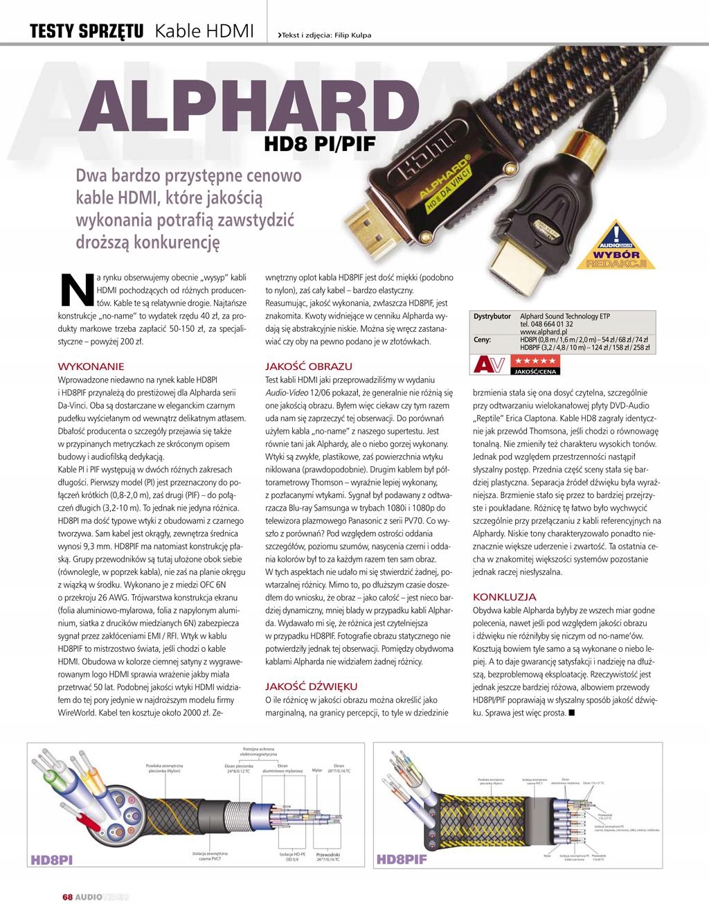 Висока якість Кабель, який ми пропонуємо, підтверджено лабораторними тестами, виготовлено з безкисневих мідних проводів найвищої чистоти та 24-каратних позолочених штекерів, припаяних срібним сполучником - перевірка журналу AUDIO-VIDEO представлена нижче: