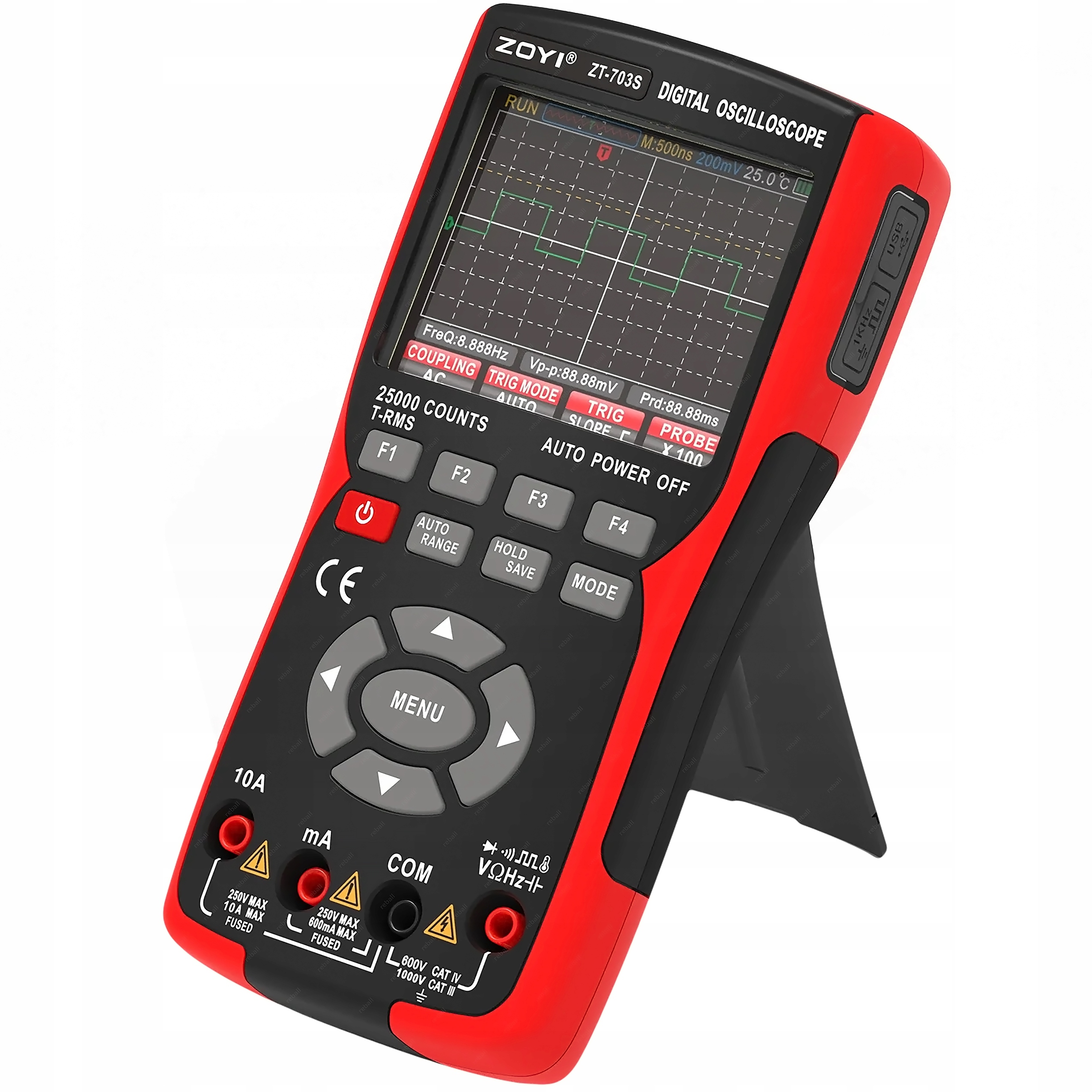 Цифровий вимірювальний прилад ZOYI ZT-703S 3-в-1 із вбудованим двоканальним осцилографом 50 МГц необхідний у кожній електричній та електронній майстерні та вдома. Простий у використанні. Компактний і компактний дизайн, оснащений похилою підставкою, яка полегшує спостереження за вимірюваннями, і захисним гнучким корпусом, який захищає від механічних пошкоджень.