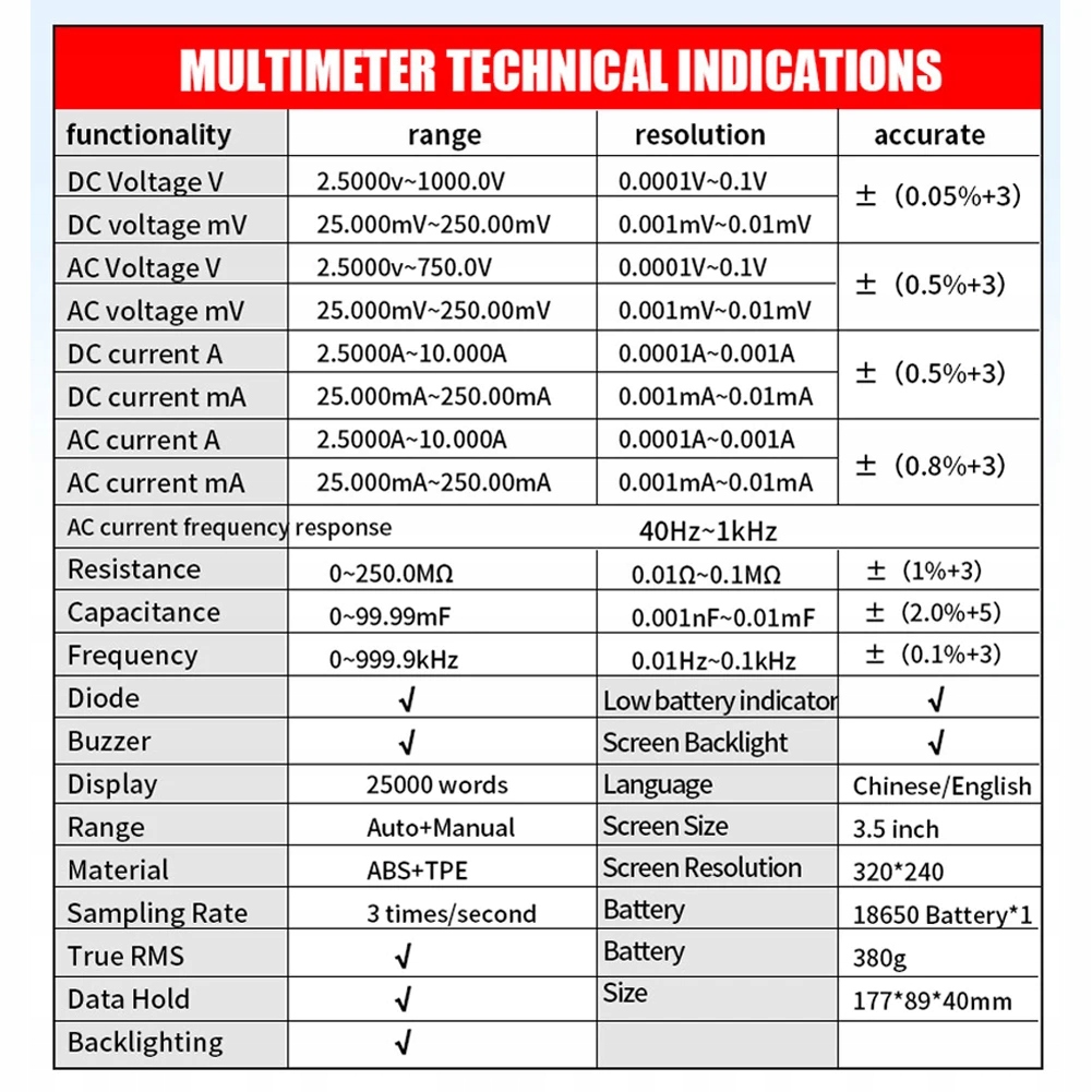 - змінний струм (мА): 25 000 мА-250,00 мА, ±(0,8%+3),