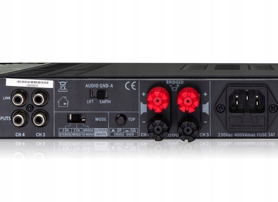 Підсилювач оснащений 4 каналами з вихідною потужністю 4x 80 Вт при 4 Ом з можливістю міст для отримання підсилювача з двома каналами потужністю 2x 130Wі 8 Ом.