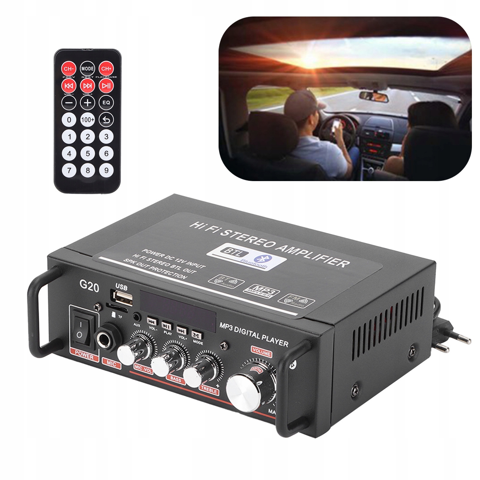 108 МГц, з високою, низькою функцією регулювання об'єму. 3. Низьке спотворення забезпечує більш виражений, сильніший і сильніший звук. Два основні виходи каналу з функцією дистанційного керування. 4. Вхід потужності постійного струму/змінного струму, підходить для будинку або автомобіля. Простий у використанні, пряма збірка та використання. 5, виготовлений з металу, має переваги сили та довговічності та тривалого життя.
