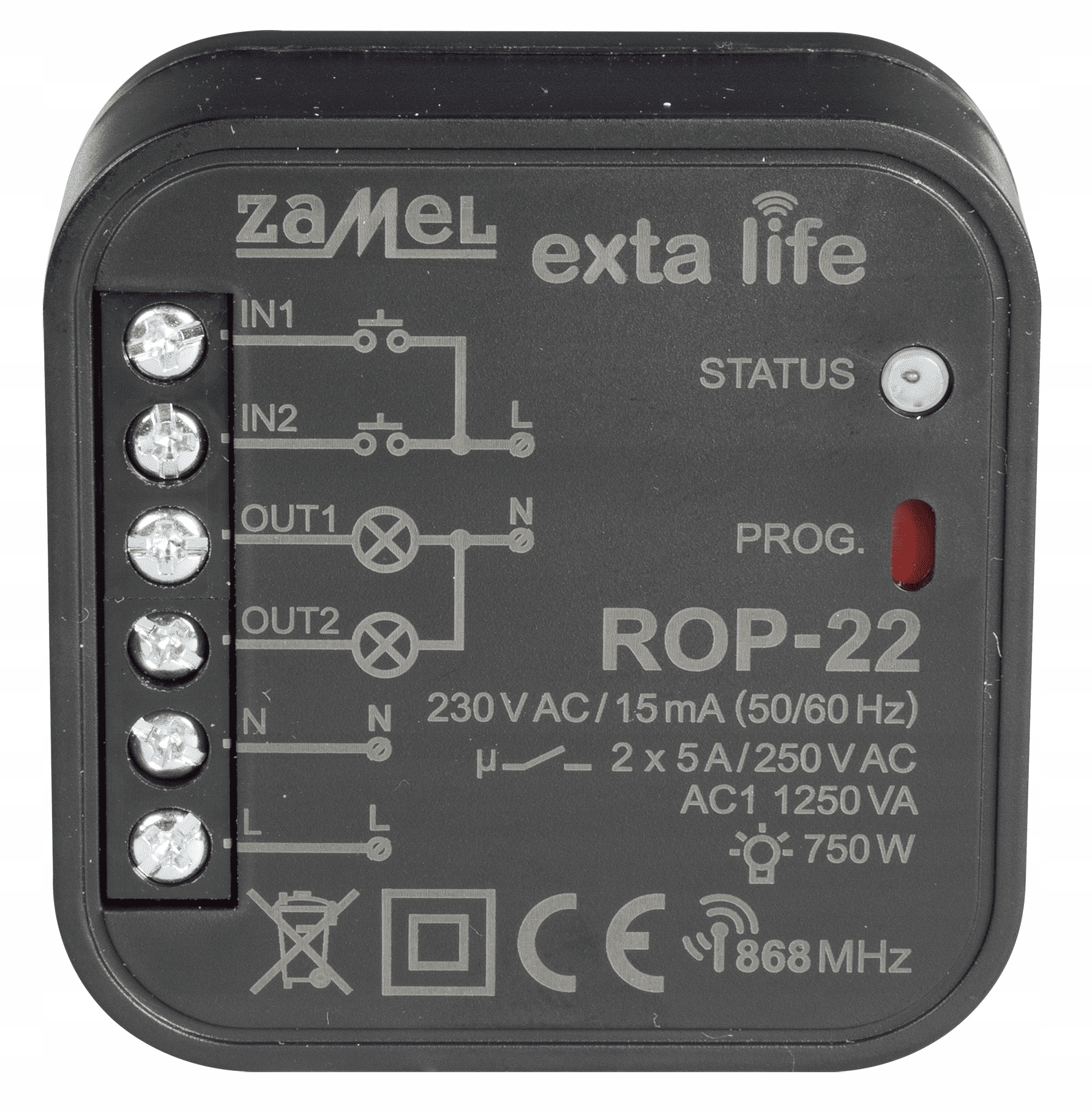 Приймач радіостанції ROP-22 є завершальним елементом системи EXTA LIFE, який дозволяє незалежно керувати будь-якими двома пристроями/ланцюгами 230 В змінного струму. Він спеціально призначений для керування лампами розжарювання, галогенними, світлодіодними та компактними люмінесцентними лампами CFL. Приймач також працює з джерелами світла, що живляться від тороїдальних і електронних трансформаторів. Завдяки 2 незалежним виходам добре працює з двосекційними лампами або для незалежного керування двома ланцюгами освітлення. Двонаправлений зв'язок між приймачем і контролером гарантує, що поточний стан приймача завжди відображається в мобільному додатку. Цей спосіб зв'язку також дозволяє змінювати вибрані параметри приймача та дистанційно додавати передавачі (без доступу до приймача). Реалізований алгоритм кадрового кодування забезпечує безпеку управління. ROP-22, крім контролера, може паралельно управлятися від передавачів системи EXTA LIFE. У приймач можна ввести більшу кількість передавачів, що дозволяє здійснювати незалежне керування з кількох місць. Пристрій призначений для монтажу в під- та накладні монтажні коробки. Додаткові дротові входи, які можна налаштувати з контролера, збільшують функціональність керування. У приймачі реалізована функція дистанційного оновлення ПЗ з рівня контролера.