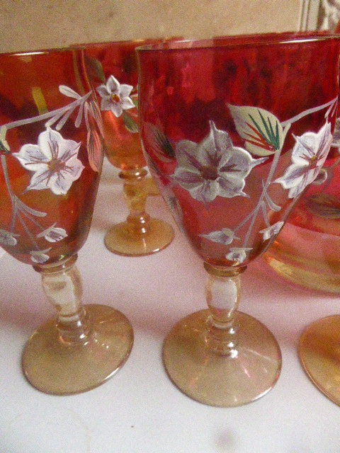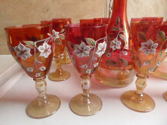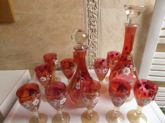2 KARAFKI + 11 KIELISZKÓW RĘCZNIE MALOWANE KWIATY BOHEMIA Czechy