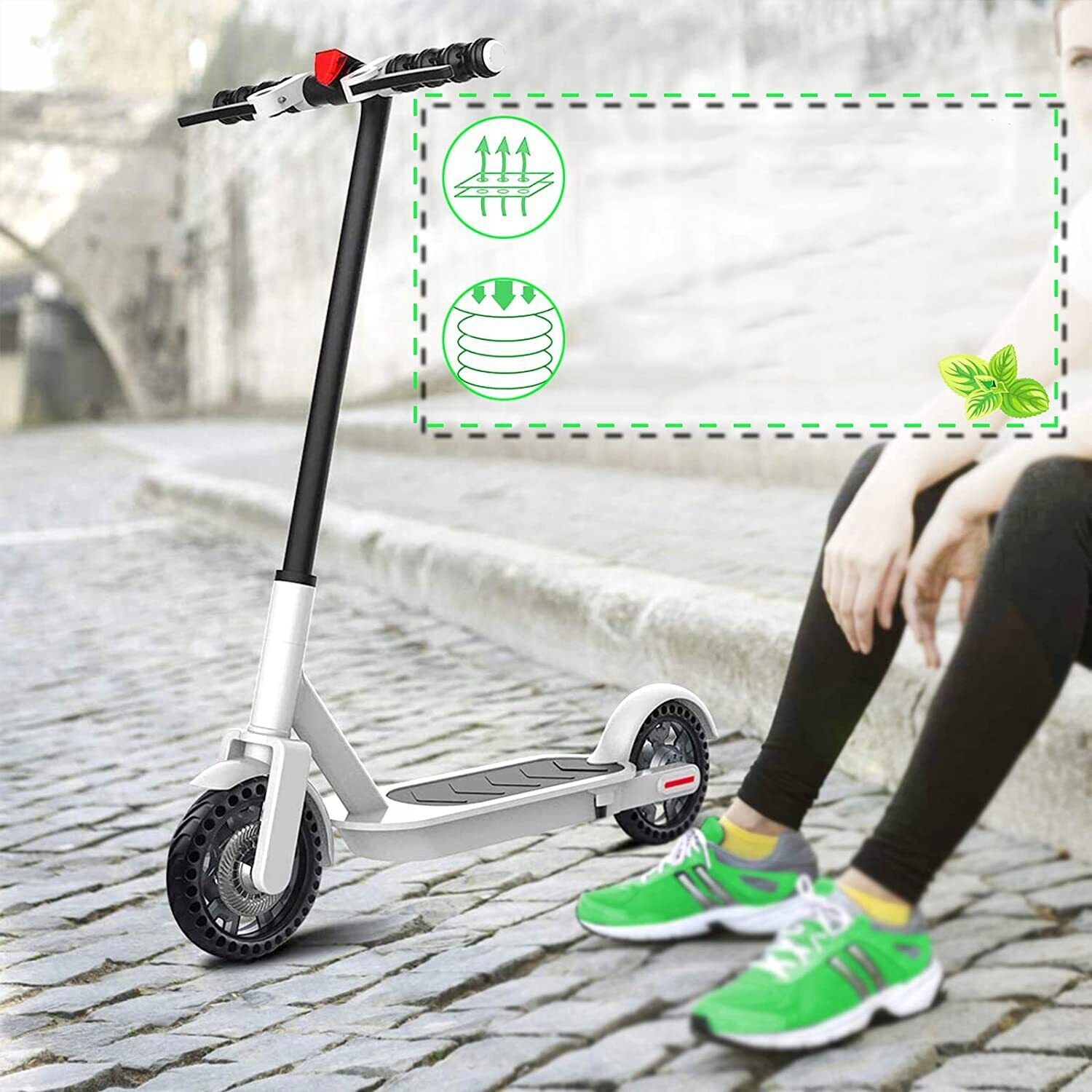 🛴 Суцільна шина із захистом від спустошення. Ця суцільна шина не потребує повітря, накачування, ремонту, технічного обслуговування, проколів або камери, тож вам не потрібно турбуватися про прокол. Чудова здатність поглинати удари робить шину твердішою за традиційну пневматичну шину.