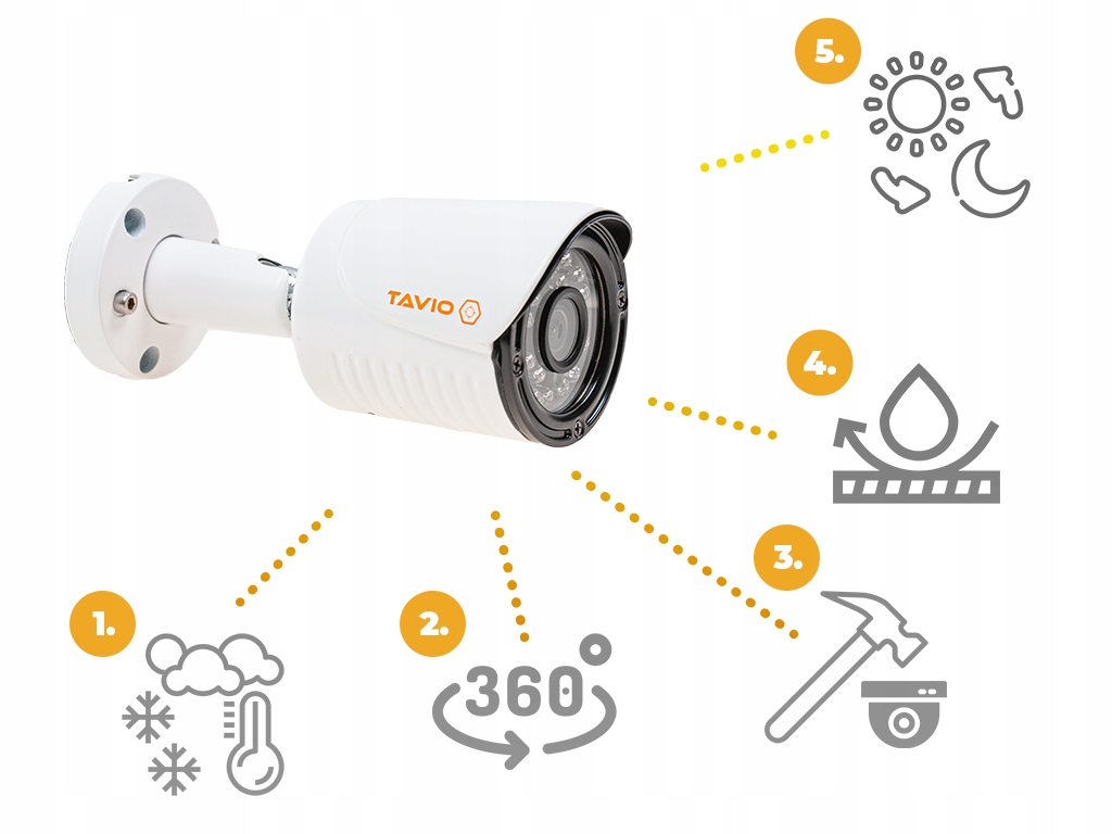 Камера Tavio оснащена механічним інфрачервоним фільтром, який використовується для захоплення оптимальних значень світла, що досягає датчика камери. Це робить зображення яскравішим і покращує його якість. Камера використовує ефективний інфрачервоний освітлювач, виготовлений з високоефективних діодів, створюючи світловий потік з характеристиками, оптимально схожими на спостережуваний кадр. Завдяки цьому вони рівномірно освітлюють всю сцену, мінімізуючи пересвітлення центру зображення та недосвітлення його країв. Використання інфрачервоних діодів дозволяє підсвічувати зображення на відстані до 20 м