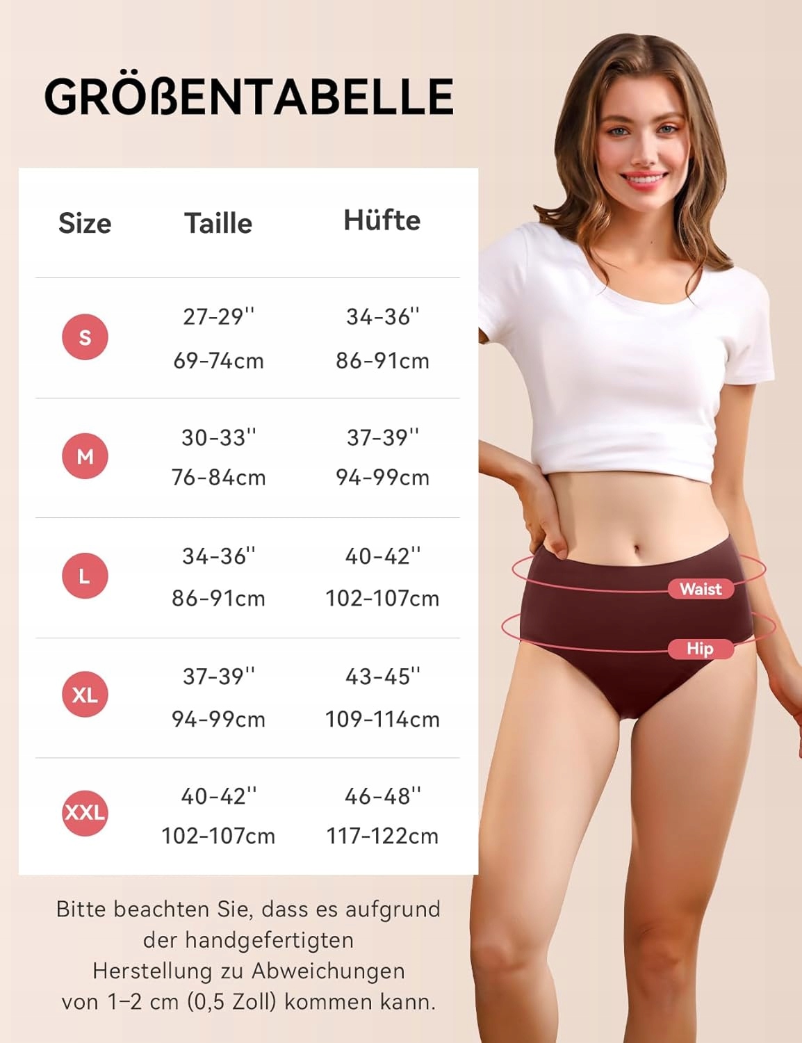 Захист вдень і вночі: вставка вбираючих денних штанів має максимальну ємність 50 мл, що еквівалентно приблизно 4 тампонам. Нічний варіант має ємність 100 мл, що еквівалентно приблизно 8 тампонам. Захищає вас і вдень, і вночі