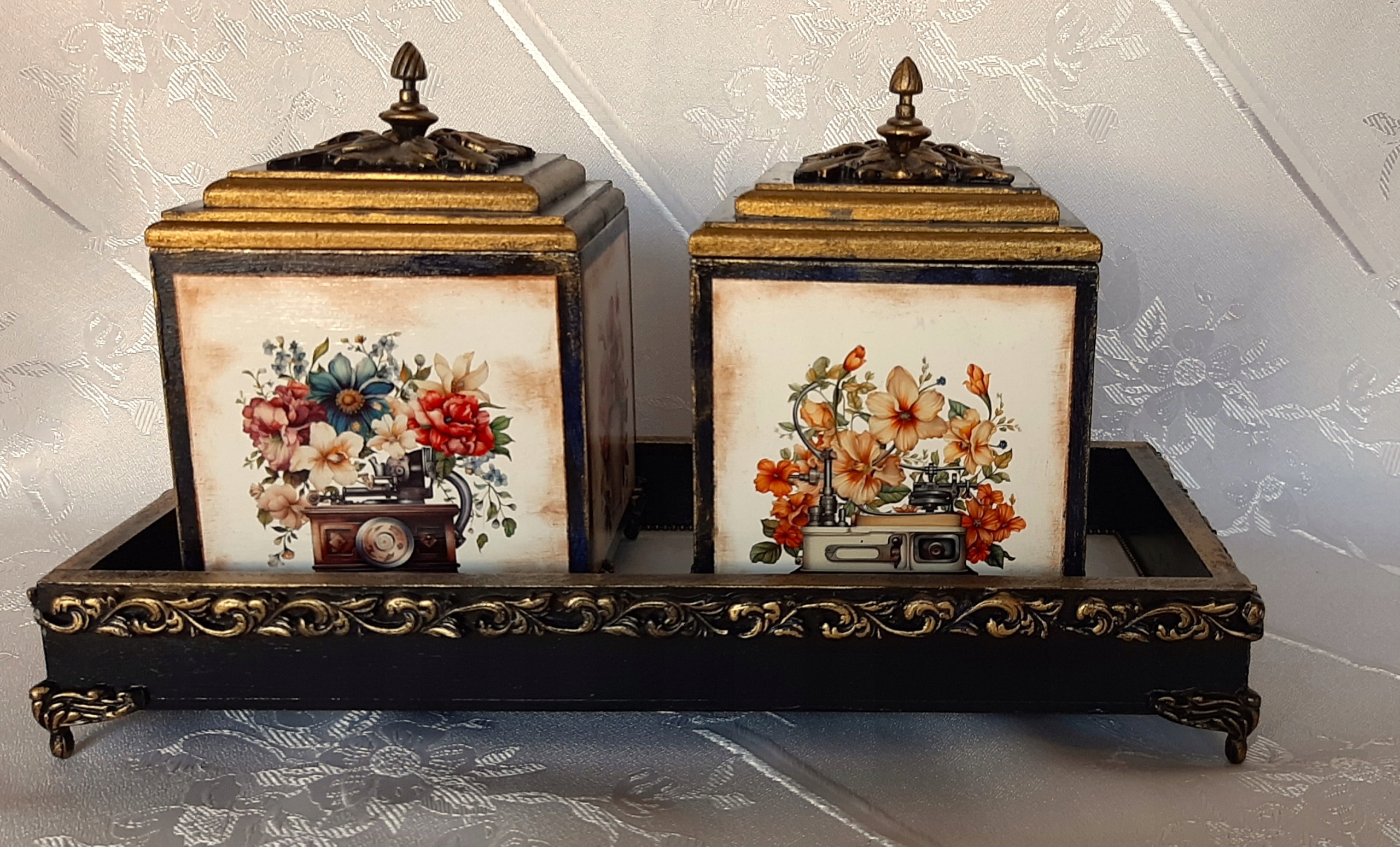 2 старовинні контейнери з кришкою на лотку. Розмір контейнера 10 см х 10 см х 13 см.